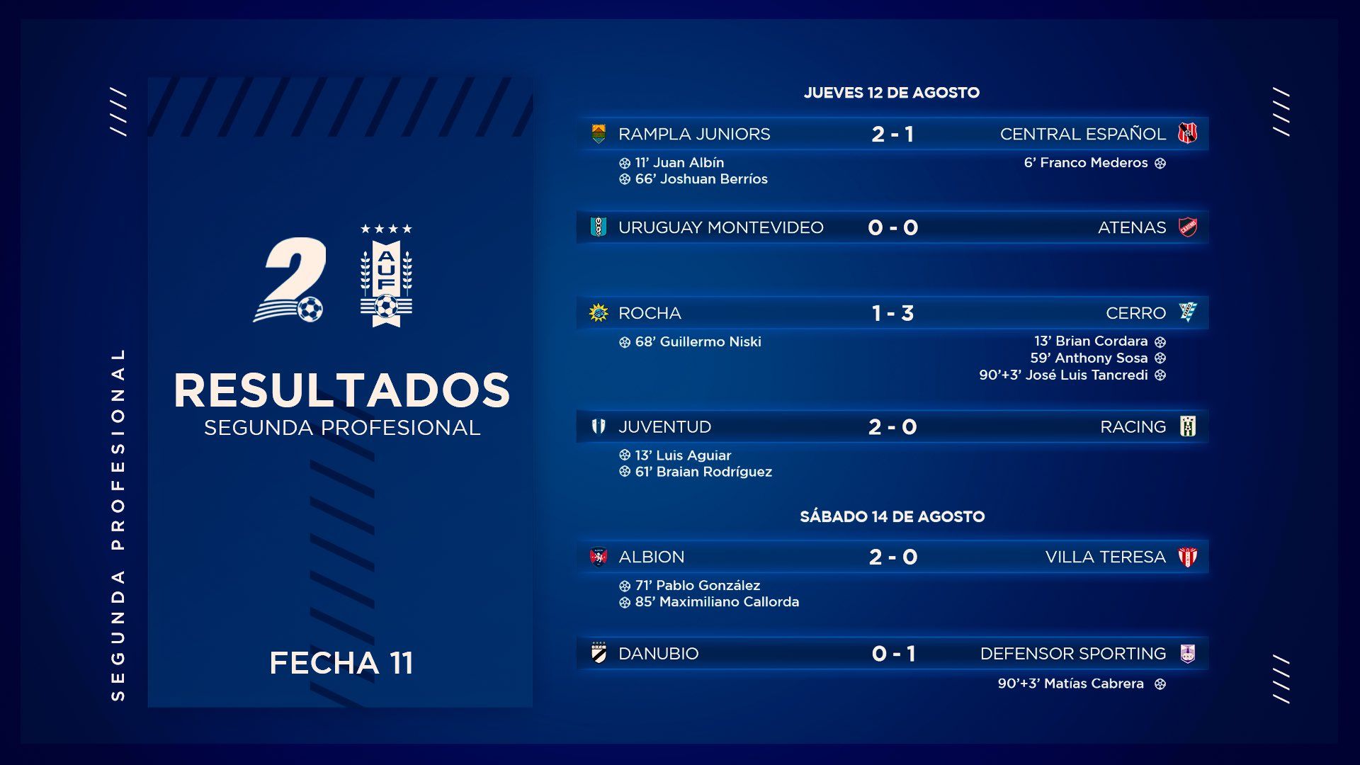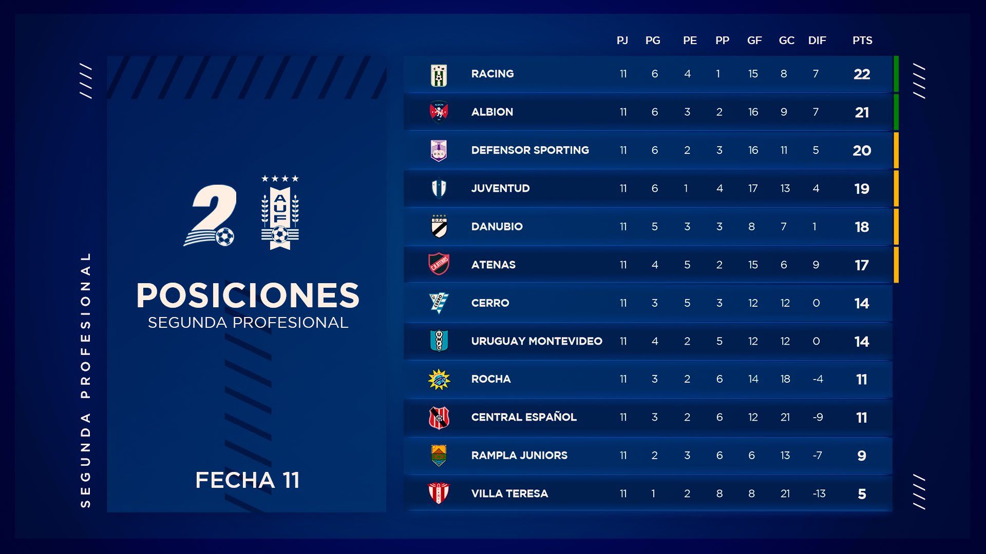 Terminó la primera rueda de la Segunda Profesional, Albion le ganó a Villa Teresa y se colocó a una unidad del puntero Racing, Defensor venció a Danubio y quedó tercero; recordemos que suben directo los dos primeros y cuatro van a play off, vuelven a jugar el 8 de setiembre.