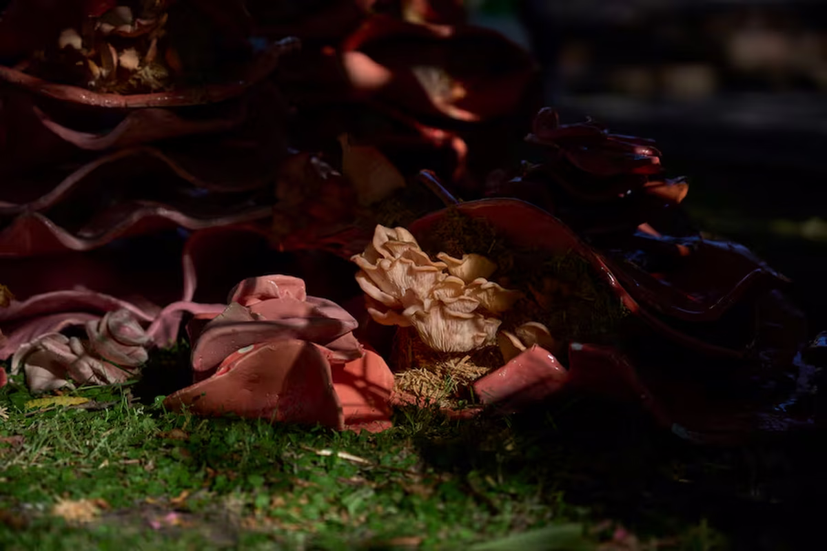 Estaba leyendo un libro de hongos de un divulgador muy de moda en este momento, que se llama Merlin Sheldrake, y me iban cayendo una cantidad de fichas y llegó a mi cabeza en ese segundo cómo quería hacer la obra de los hongos rosados. Escribí una carilla, y ese fue el texto que bajó a mí. Fue como muy clara la reflexión y las posibilidades. En una obra anterior, ya había intentado sembrar hongos en mis obras. Yo trabajo con un equipo maravilloso que da cuerpo y posibilidades y talento y aportan una cantidad de cosas nutritivas a mi obra. Y Cecilia Morales tiene una obra personal con esculturas que siembra con hongos también. Dije, “esta es la persona ideal que tengo que invitar para saber cómo sembrar hongos en mis esculturas”. Entonces, le planté la idea, le gustó, sembró hongos en mis esculturas y se tuvo que ir de viaje, me dejó las instrucciones de cómo hacer que crecieran los hongos. Y lo hicimos con mi familia, pero somos medio inútiles para estas cosas. Cero constancia, pedirle a los niños que rieguen, no funcionó tanto. Igualmente los hongos crecieron, crecieron unos días antes de la EXPO. Y hablando con Cecilia, me dijo que capaz que le tendríamos que haber dado menos luz o más oxígeno. Y ahí me di cuenta que también era un proceso hasta cierto punto manipulable. Y se me ocurrió plantear el tema de la fructificación sincrónica, o sea que muchas personas al mismo tiempo, teniendo una escultura en las mismas condiciones, tratemos al mismo tiempo hacer crecer los hongos y funcionó. Así que para la expo en el Museo Nacional de los Hongos Rosados, hubo hongos crecidos sincrónicamente por mucha gente.