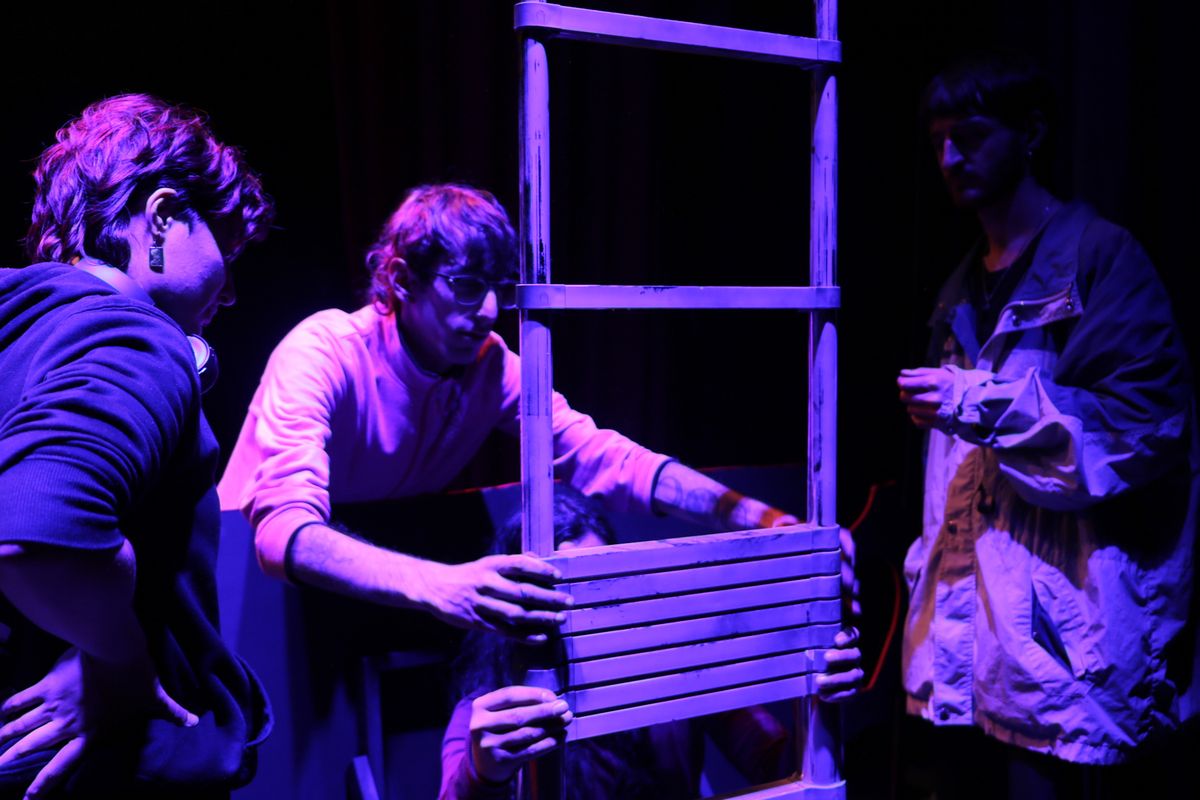 E.A.G.: Yo tuve mis re dilemas con mi propio texto, porque pasó por tantas etapas, momentos en los que me peleaba con esto. Yo no busco representar a nadie. De pedo capaz que me puedo representar a mí. Había partes en las que sentía que lo escrito ya no era mi yo de ahora, pero por un respeto a la Eli que lo escribió en 2022, lo mantengo, y capaz que incluso hasta yo estoy en desacuerdo con ciertas cosas que digo. Me lo permito y está perfecto. Creo que se ha ido dotando mucho del aporte del grupo porque tuvimos una instancia bien de laboratorio en la que investigamos, cartografiamos, hicimos muchos ejercicios de diseño para la construcción del personaje. A veces es más trabajo físico, a veces es más trabajo entre plástico y de mesa, entonces eso creo que nos fue permitiendo ir generando un código común de entendimiento, que seguirá teniendo que ser pulido, y que tendrá miles de cositas desde lo técnico, actoral, que seguir ajustando, pero también hay un pacto muy fuerte con la honestidad: No puedo pretender que alguien que no tiene tanta cancha en actuación, por ejemplo, no sesee. Vas a sesear, está bien, sesea en escena, no importa. Es parte de lo que somos, de lo que hacemos.