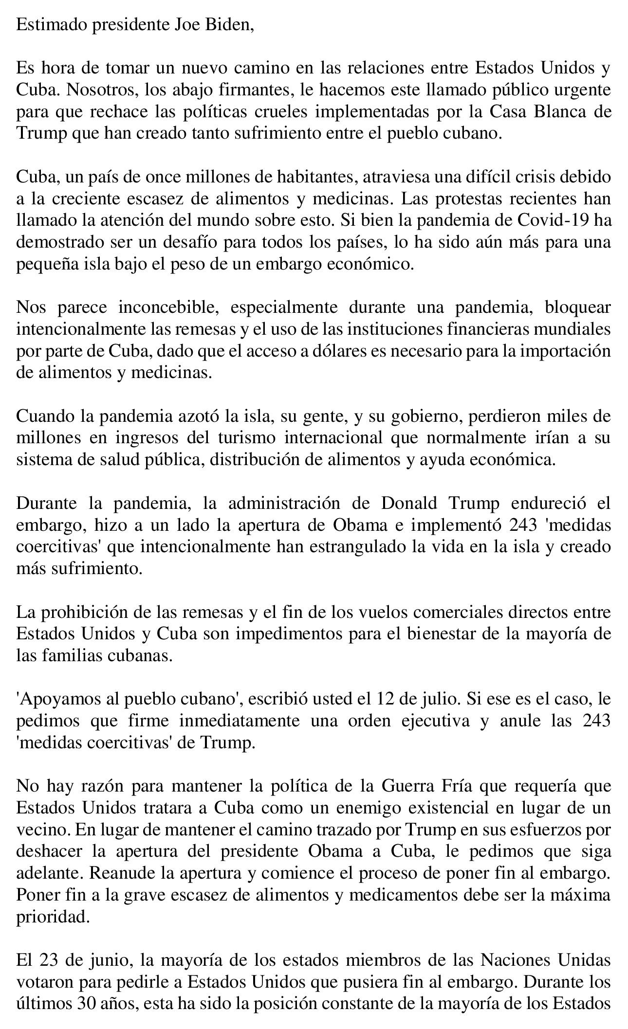 Entienden que “no hay razón para mantener la política de la Guerra Fría que requería que Estados Unidos tratara a Cuba como un enemigo existencial en lugar de un vecino. En lugar de mantener el camino trazado por Trump en sus esfuerzos por deshacer la apertura del presidente Obama a Cuba, le pedimos que siga adelante. Reanude la apertura y comience el proceso de poner fin al embargo. Poner fin a la grave escasez de alimentos y medicamentos debe ser la máxima prioridad”.