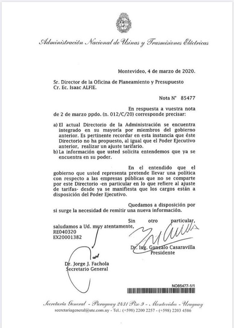En una nota remitida a la OPP el presidente de la Administración de Usinas y Transmisiones Eléctricas (UTE), Gonzalo Casaravilla, recuerda que el actual directorio “está integrado por en su mayoría por miembros del gobierno anterior. Es pertinente recordar en esta instancia que éste directorio no ha propuesto, al igual que el Poder Ejecutivo anterior, realizar un ajuste tarifario”.