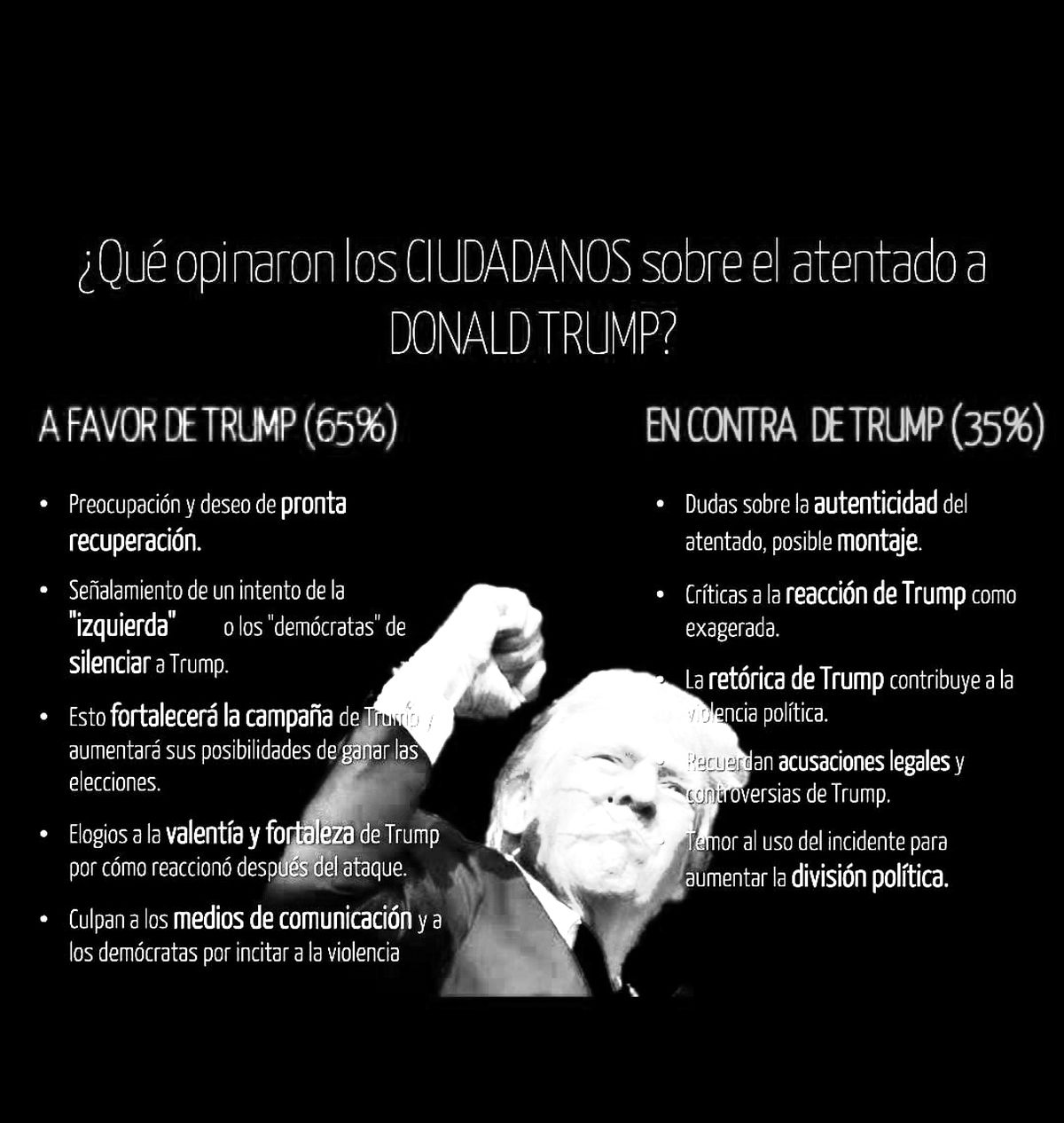Obviamente genera adhesiones y rechazos, la mayoría violentos. Recuérdese cuando perdió con Joe Biden. Se instaló en un hotel cercano al Congreso y desde allí guió a sus “tropas” contra el Capitolio. Irrumpieron, rompieron, ocuparon, todo en nombre de la libertad. Aún convive con juicios por los hechos señalados. ¿Cómo creció esa horda? Porque hubo una persona que los interpretó y se convirtió en el “padre” de las masas desorientadas. (¿Puede haber una guerra civil en EEUU? Un estudio difundido el lunes 15 de julio, dice que más de un 40 % de los estadounidenses creen que es posible en los próximos 10 años).