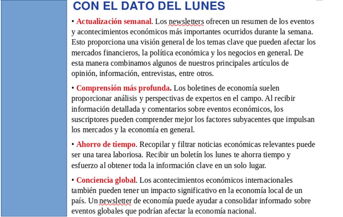 En este contexto disponer de un newsletter es relevante en la medida que en sus textos se abordan los principales temas en materia económica. Nuestro desafío es que sea de interés y permita identificar temas claves. El objetivo es facilitar y generar ayudas para los tiempos que corren, poniendo a disposición información rápida, crítica y actualizada.