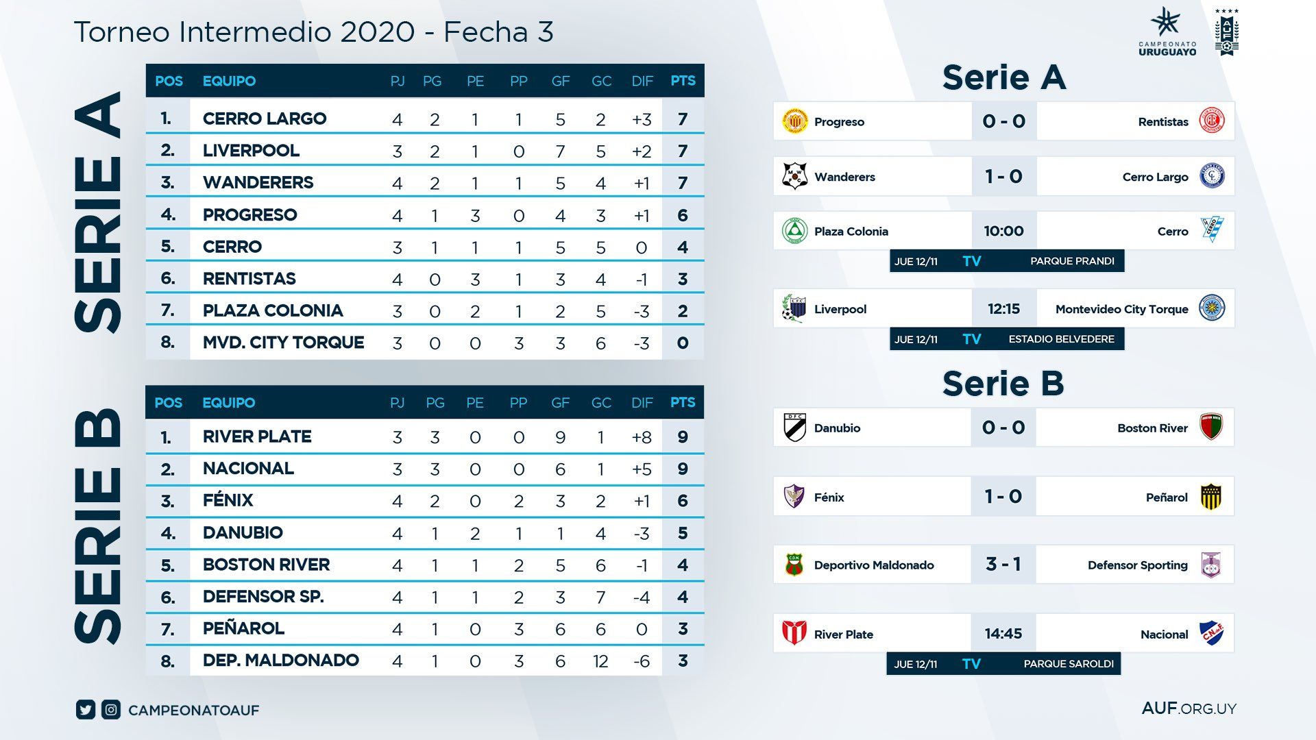 Tres partidos se jugaron por el Intermedio este miércoles, fue empate entre Danubio y Boston River, Deportivo Maldonado venció a Defensor y Fénix a Peñarol; mañana se juega el complemento.