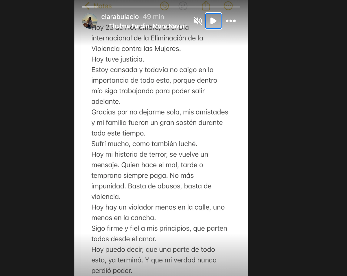 “Hoy 25 de Noviembre, es el Día Internacional de la Eliminación de la Violencia contra las Mujeres. Hoy tuve justicia. Estoy cansada y todavía no caigo en la importancia de todo esto, porque dentro mío sigo trabajando para poder salir adelante... Sufrí mucho, como también luché. Hoy mi historia de terror, se vuelve un mensaje. Quien hace el mal, tarde o temprano siempre paga. No más impunidad. Basta de abusos, basta de violencia. Hoy hay un violador menos en la calle, uno menos en la cancha... Hoy puedo decir, que una parte de todo esto, ya terminó. Y que mi verdad nunca perdió poder.”