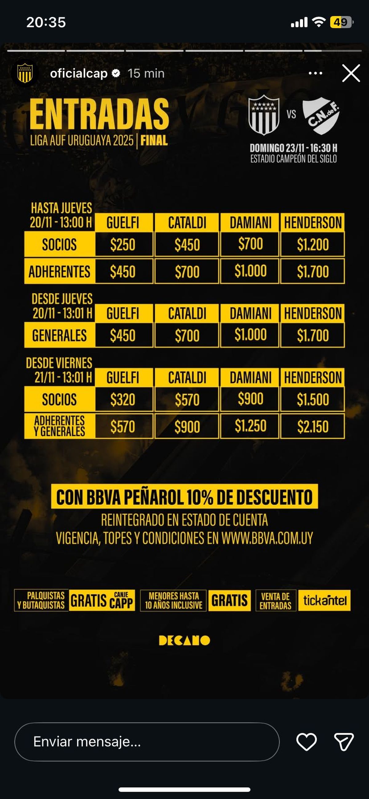 Peñarol dio a conocer los precios de las entradas para la primera final clásica por el Campeonato Uruguayo ante Nacional, que será este domingo a las 16:30 horas en el estadio Campeón del Siglo.