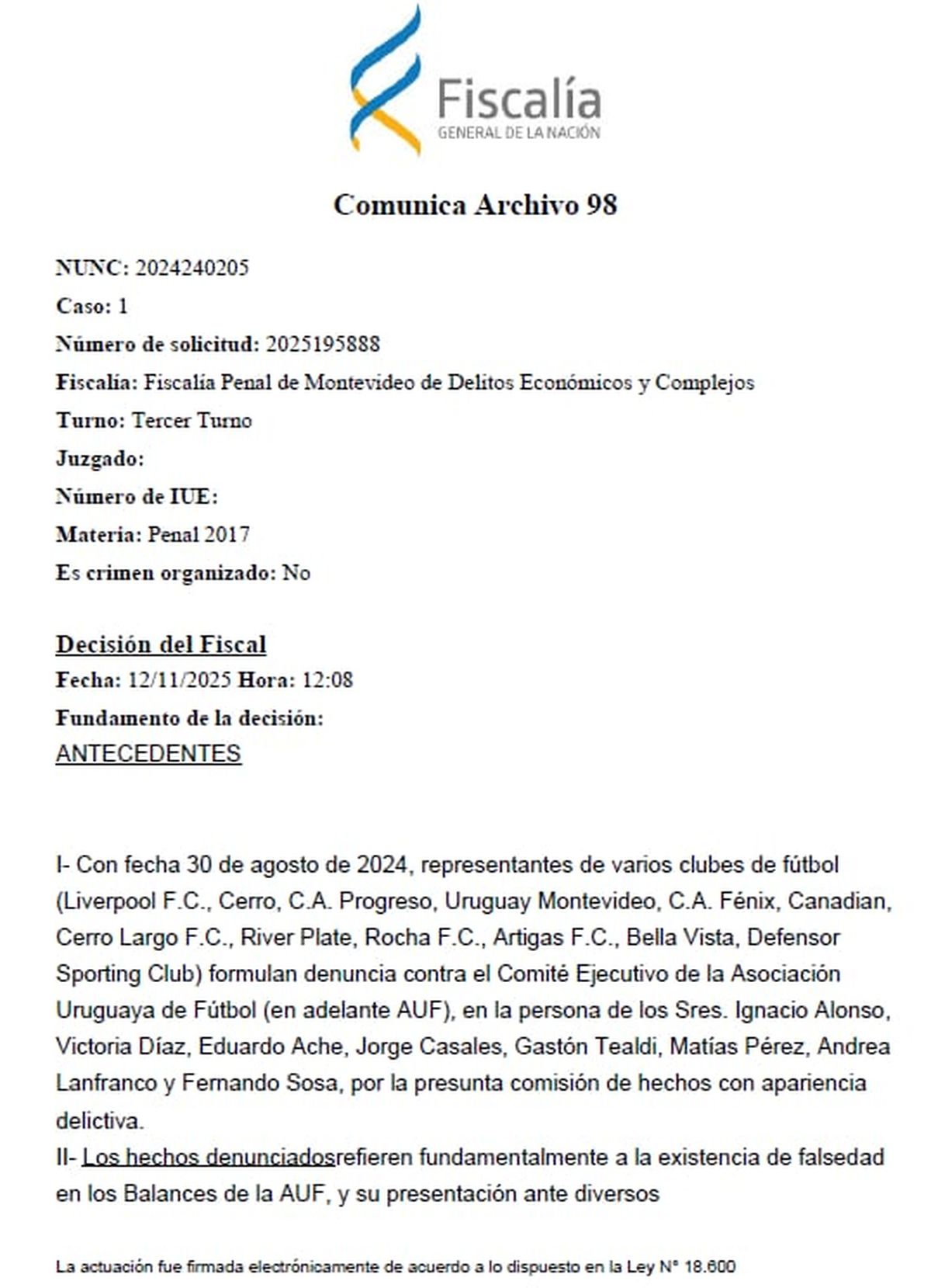 La causa se había iniciado en setiembre de 2023, cuando varios clubes de Primera, Segunda y la Primera Divisional Amateur —entre ellos Cerro, Cerro Largo, Defensor Sporting, Fénix, Liverpool, Progreso, River Plate, Uruguay Montevideo, Artigas SAD y Bella Vista— denunciaron presuntas irregularidades en los balances de la AUF correspondientes a los ejercicios 2021, 2022 y 2023.