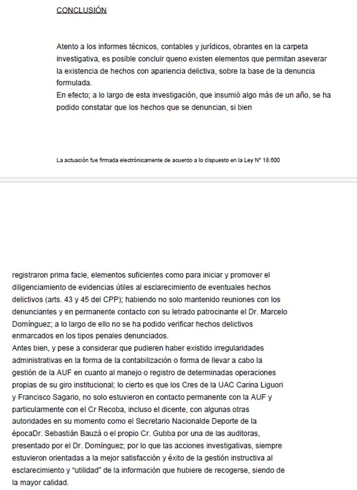 Sin embargo, durante el desarrollo de la investigación, la AUF presentó toda la documentación contable y los balances requeridos, los cuales fueron analizados por el equipo técnico del Ministerio Público. Según el fiscal Rodríguez, no existieron inconsistencias ni elementos que permitieran sostener la hipótesis de un desvío de fondos.
