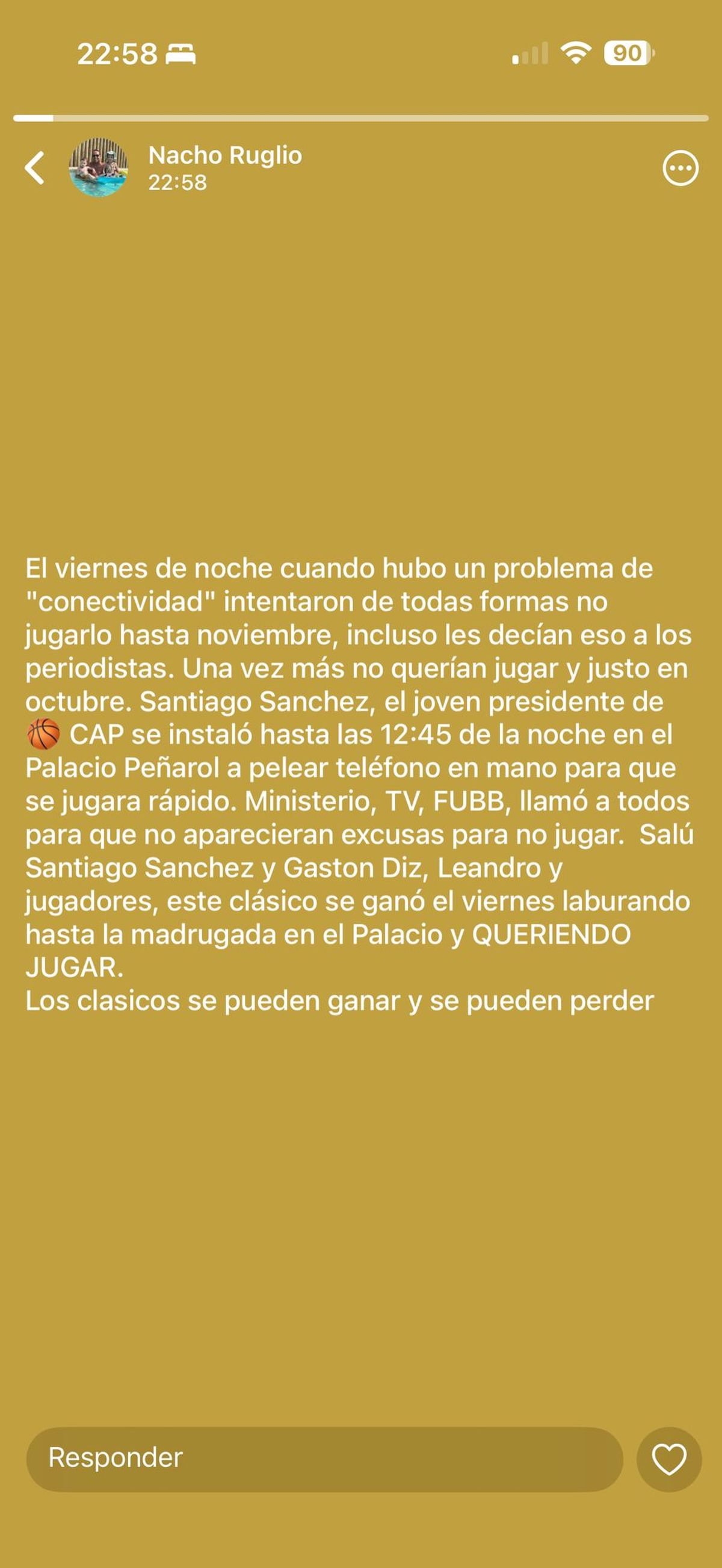 El presidente de Peñarol, Ignacio Ruglio, publicó un estado de WhatsApp tras la victoria aurinegra frente a Nacional en basketball, en el que apuntó contra quienes, según él, intentaron evitar la disputa del clásico luego de la suspensión del partido prevista originalmente para el viernes pasado.