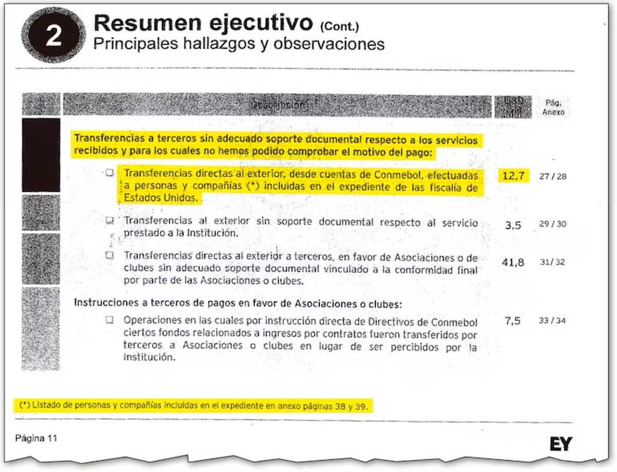 El periódico logró acceso al resultado de esta auditoría de 47 páginas y cuyo resultado permanecía oculto ocho años después. El asunto grave en Paraguay es que el actual jefe de la Conmebol, también aparece en el listado como habiendo recibido al menos 374.000 dólares sin comprobantes.