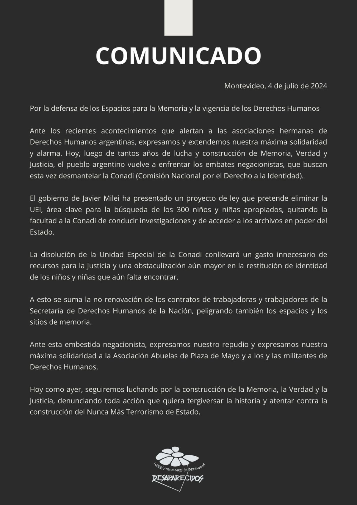 "Ante esta embestida negacionista, manifestamos nuestro repudio y expresamos nuestra máxima solidaridad a la Asociación Abuelas de Plaza de Mayo y a los y las militantes de Derechos Humanos", manifestó la organización en el comunicado.