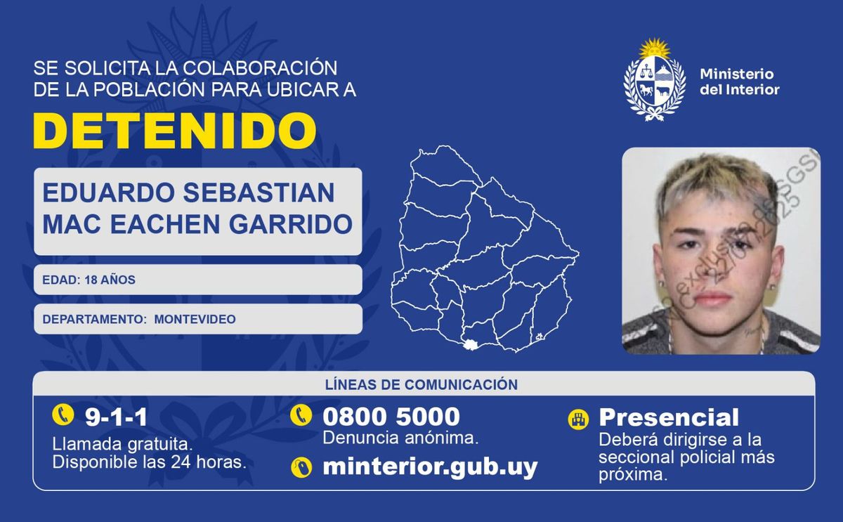 El Departamento de Homicidios de la Dirección General de Hechos Complejos concretó la detención de un joven de 18 años, identificado por el Ministerio del Interior como Eduardo Sebastian Mac Eachen Garrido, quien se encontraba requerido por su presunta participación en el homicidio ocurrido el pasado 25 de noviembre.