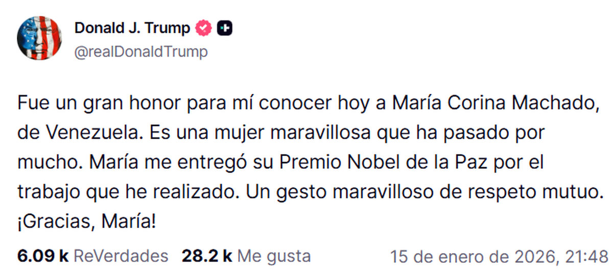 El presidente de Estados Unidos, Donald Trump, afirmó este viernes tras reunirse con la líder opositora venezolana María Corina Machado que fue “un gran honor” conocerla en la Casa Blanca y destacó el gesto que ella hizo al entregarle la medalla de su Premio Nobel de la Paz.