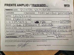 Informado que para ser candidato a Alcalde necesita pertenecer a alguna fuerza política registrada en la corte electoral, Fernando Cristino se afilió en el día de ayer al Frente Amplio en la Departamental de Maldonado de esa fuerza política.