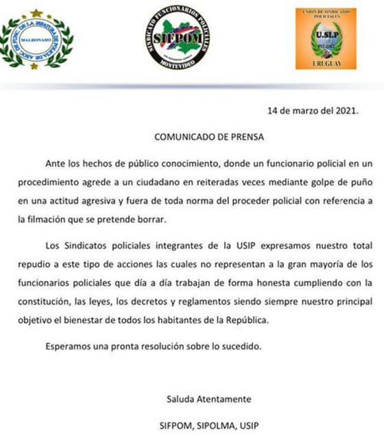 «Los sindicatos policiales integrantes de la USIP (Unión de Sindicatos Policiales) expresamos nuestro total repudio a este tipo de acciones las cuales no representan a la gran mayoría de los funcionarios policiales que día a día trabajan de forma honesta cumpliendo con la Constitución, las leyes, los decretos y reglamentos siendo siempre nuestro principal objetivo el bienestar de todos los habitantes de la República», señala un comunicado.