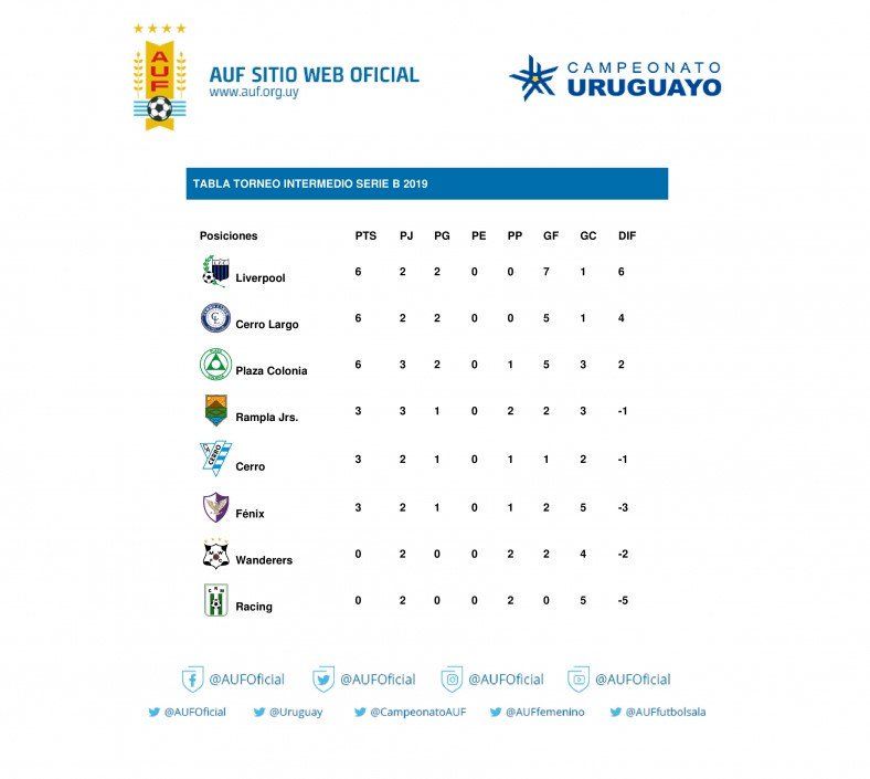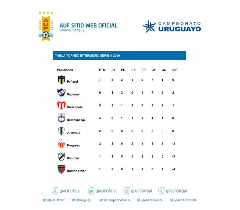 Peñarol (18) 38; Cerro Largo (17) 33 y Nacional (18) 33; Fénix (17) 31; Danubio (18) 28; Liverpool (17) 26; Progreso (18) 24; Wanderers (17) 23; Boston River (17) 21; Rampla Jr (18) 21; Plaza (18) 20; Defensor (18) 20; River Plate (18) 19; Juventud (17) 16; Cerro (17) 15, Racing (17) 15.