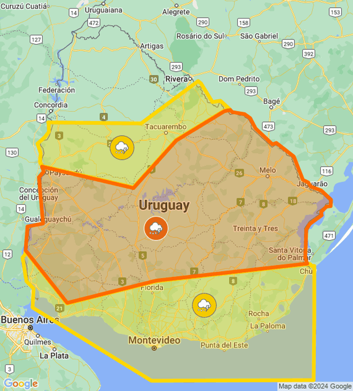 Desde las primeras horas de este martes, Inumet tiene a prácticamente todo el territorio bajo alerta naranja y alerta amarilla, tal como se aprecia en la última actualización del mapa del instituto.