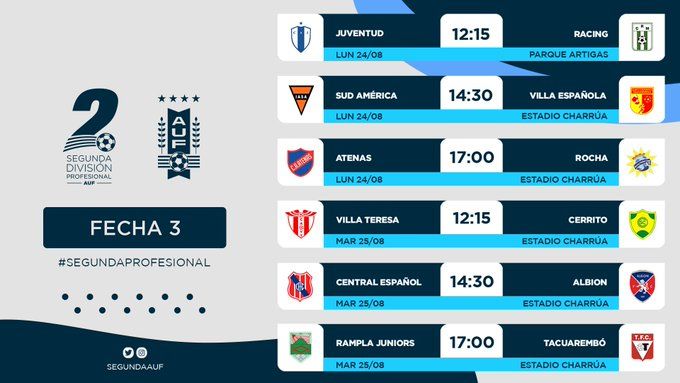 Quedó fijada la actividad para la tercera fecha de la B; se jugará entre lunes y martes, cinco partidos en el estadio Charrúa y Juventud lo hará en el estadio Artigas de Las Piedras.