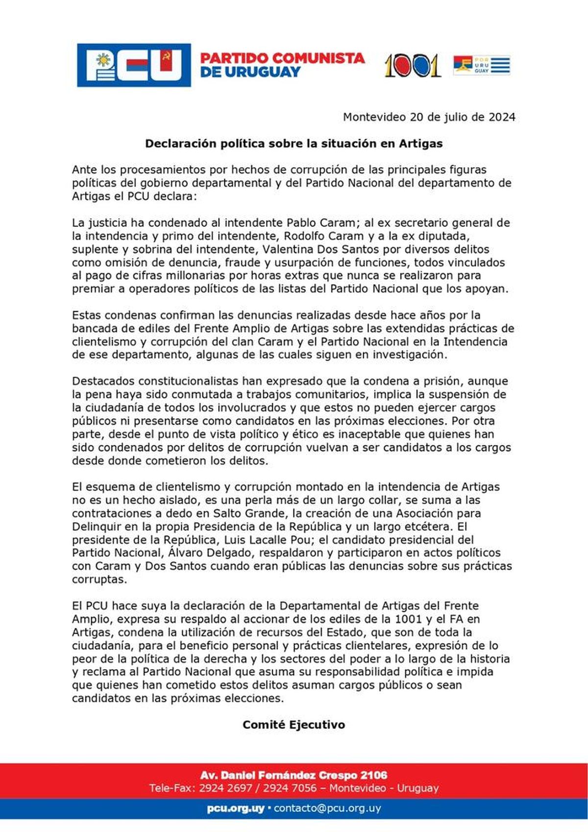 El Partido Comunista de Uruguay (PCU) emitió este sábado un comunicado en el que se expresaron en relación a las condenas que recayeron sobre el intendente de Artigas Pablo Caram y su sobrina, la exdiputada del Partido Nacional Valentina Dos Santos.