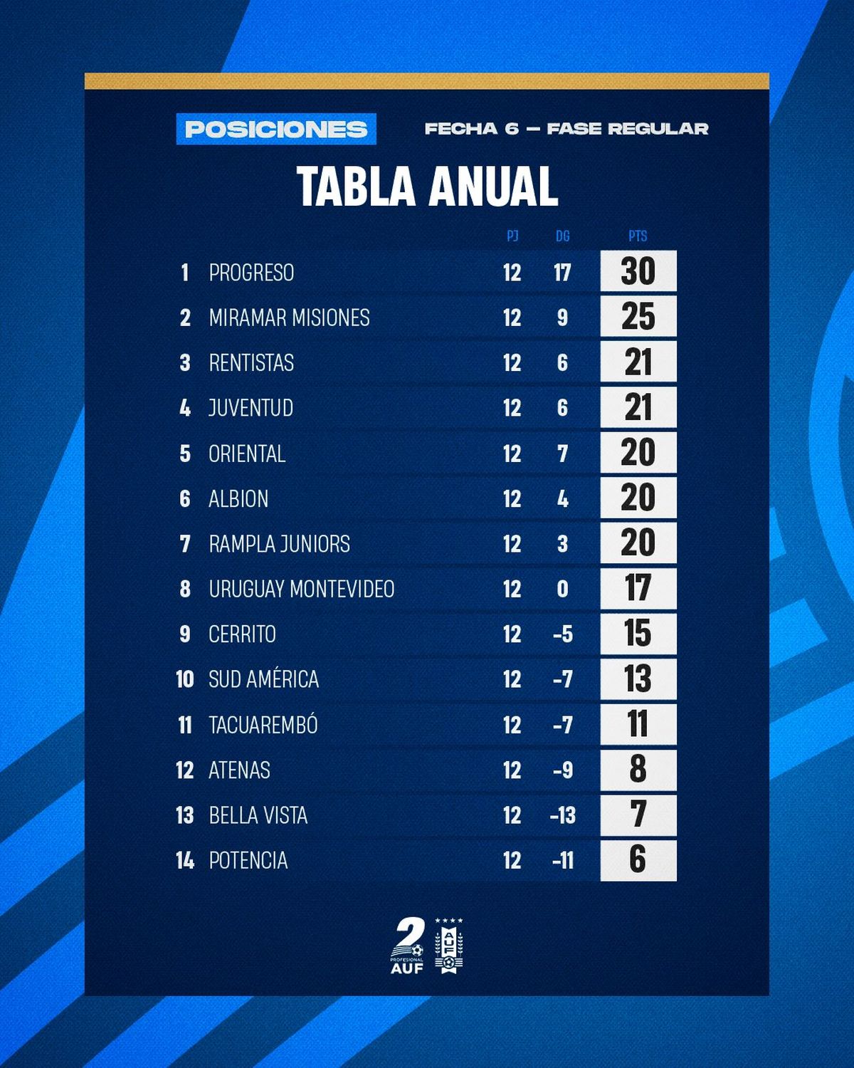 En el descenso, Potencia con un promedio de 0.500 y Bella Vista con 0.583 estarían perdiendo la categoría. Muy de cerca aparecen Tacuarembó con 0.917 y Atenas de San Carlos con 1.026 de promedio.