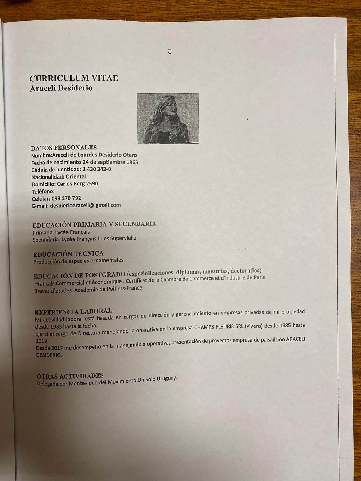 Desiderio, según su curriculum, no cuenta con experiencia para integrar el organismo y su trayectoria laboral se reduce a la administración de un vivero de su propiedad. Además, señala que es «delegada por Montevideo del movimiento Un Solo Uruguay».