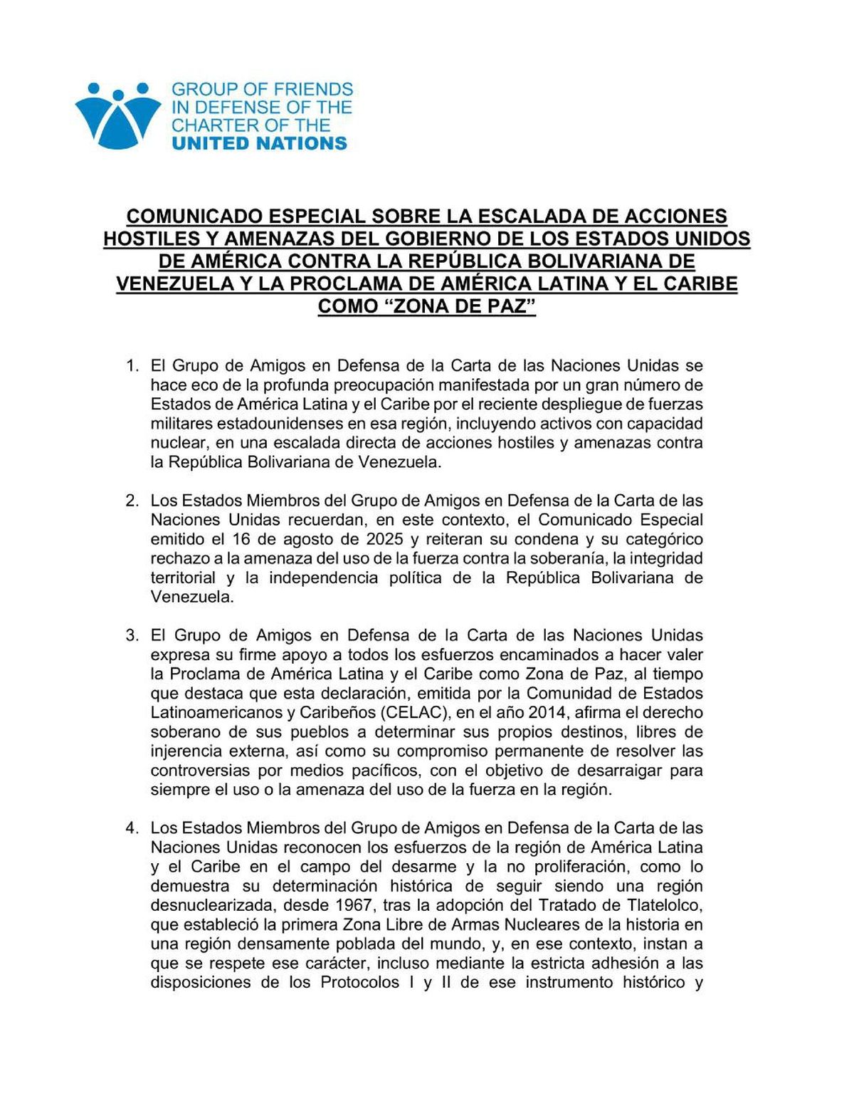 El Grupo de Amigos en Defensa de la Carta de las Naciones Unidas reafirmó su solidaridad con el pueblo de Venezuela frente a las amenazas de Estados Unidos (EEUU) en América Latina y el Caribe y, en particular, condenó la “escalada directa de acciones hostiles” de fuerzas militares con capacidad nuclear de EEUU cerca de las costas venezolanas.