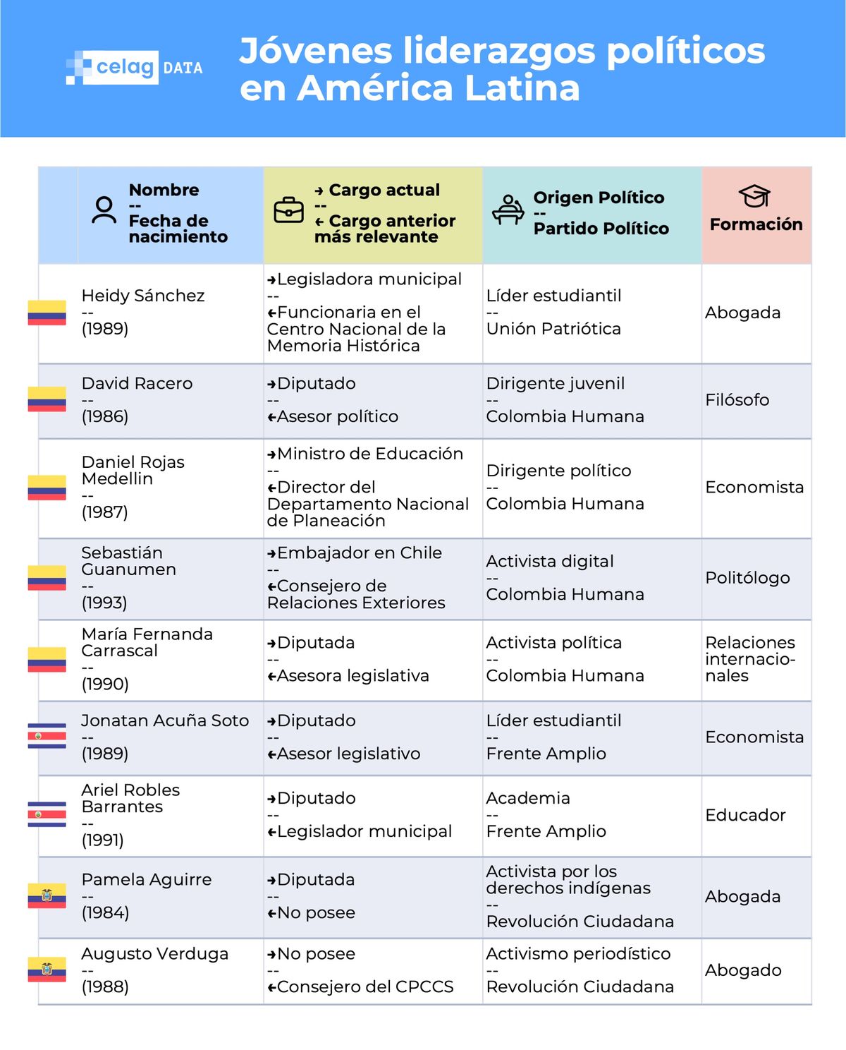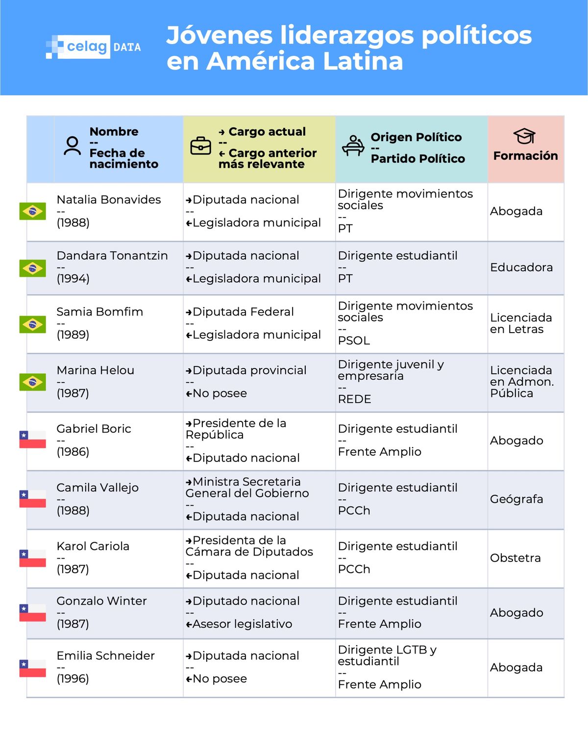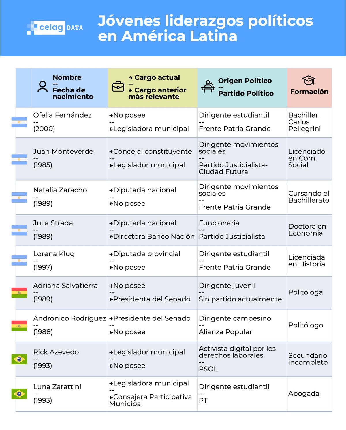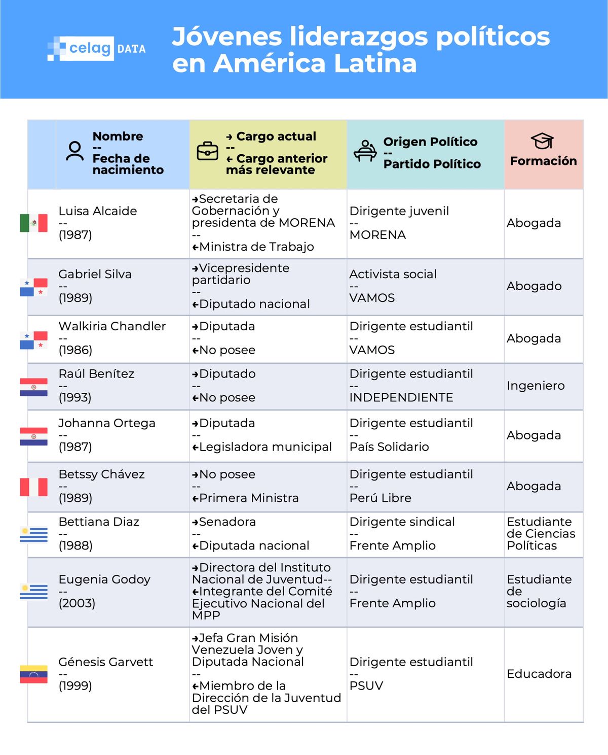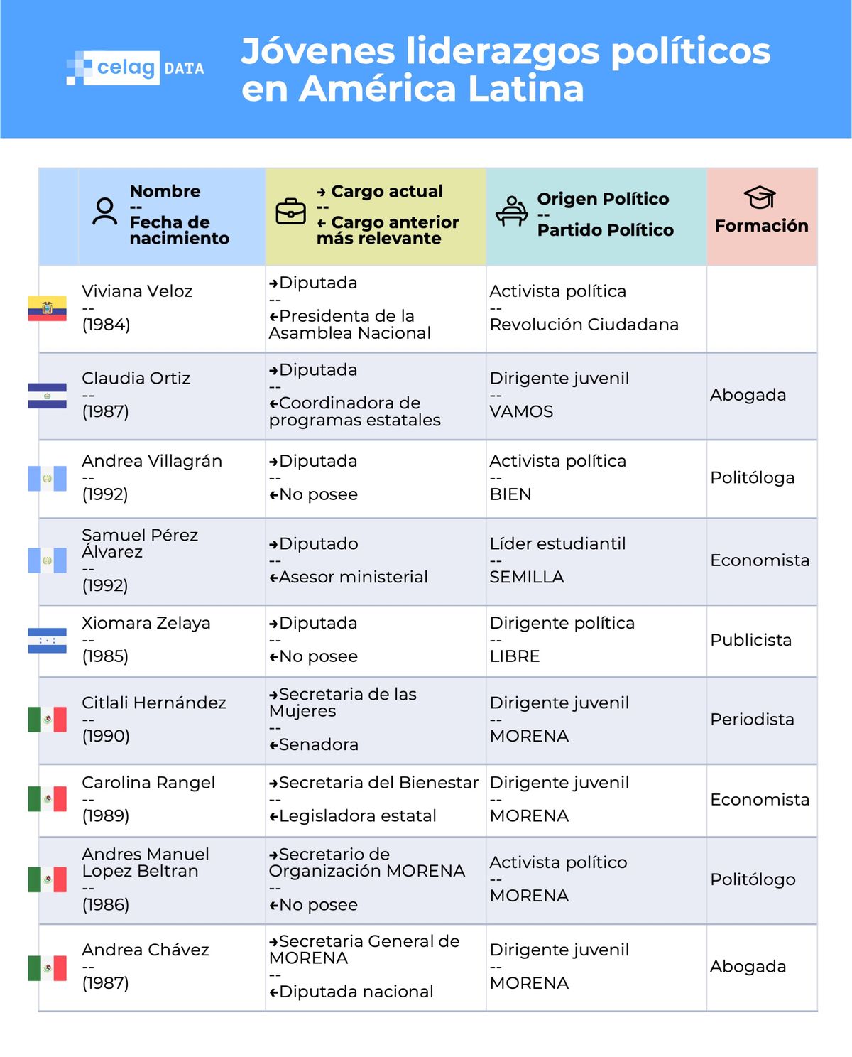 La mayoría de estos jóvenes y comenzaron sus carreras políticas como dirigentes juveniles o estudiantiles. Los perfiles más jóvenes son los de Ofelia Fernández (Argentina, exlegisladora, 25 años), Emilia Shneider (Chile, diputada, 28 años), Andrea Chávez (México, senadora, 27 años), Eugenia Godoy (Uruguay, directora de Juventud, 23 años) y Génesis Garvett (Venezuela, diputada, 26 años).