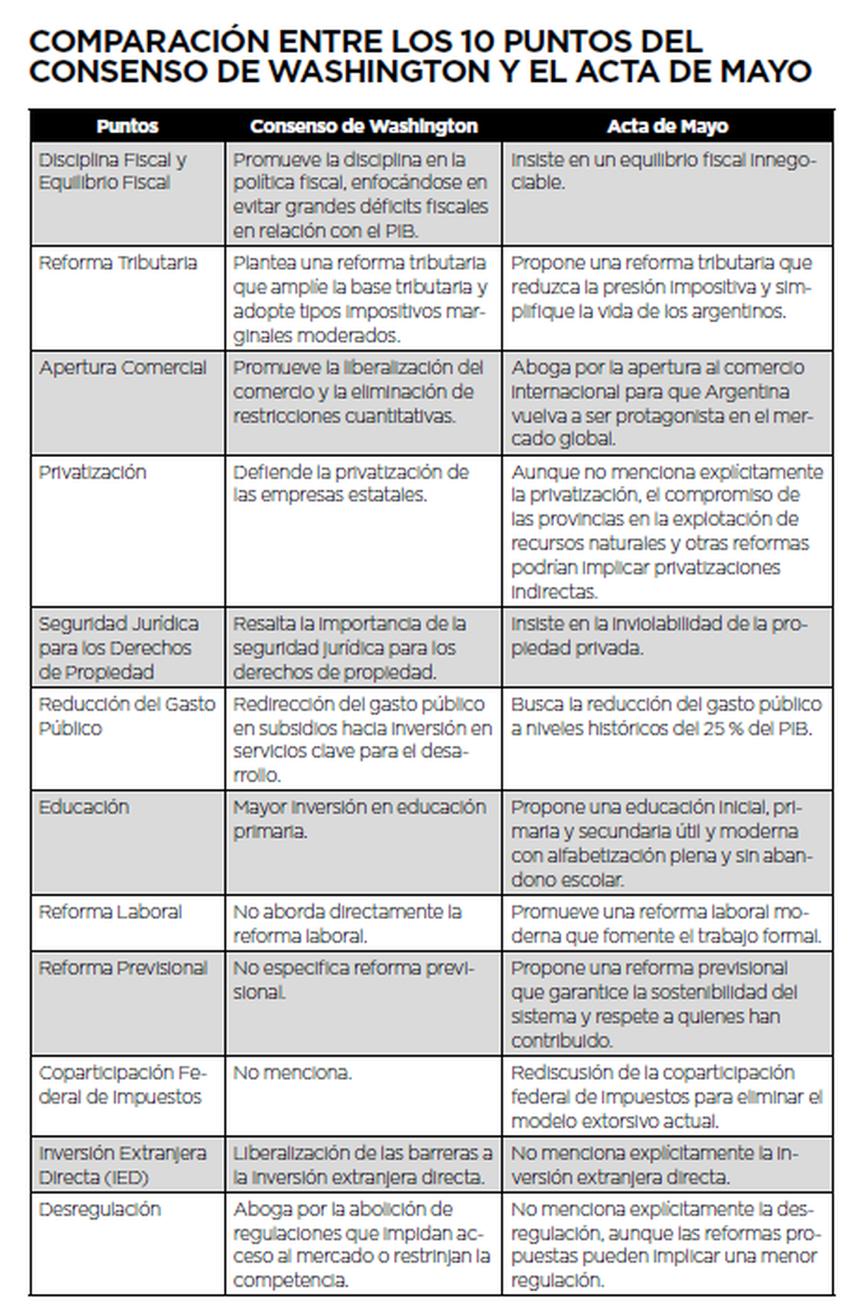 Ambos dicen prácticamente lo mismo, como se aprecia en el cuadro creado al efecto comparativo. Ambos se centran en la disciplina y equilibrio fiscal, enfatizan la reforma tributaria, consagran la liberalización plena del comercio y las barreras, las privatizaciones, la seguridad jurídica y la propiedad privada. A lo sumo difiere en cuestiones de forma en lo relativo al gasto público, donde en el caso vernáculo se exhibe un avance mayor aún en la reforma laboral y previsional, además de detallar el énfasis en la coparticipación federal de impuestos, tan atractiva para los gobernadores. Sin contar con un solo gobernador de su propio partido político, “La libertad avanza” (LLA), deberían quedar pocas dudas sobre la colaboración genuflexa de peronistas, radicales y del partido de Macri (PRO).