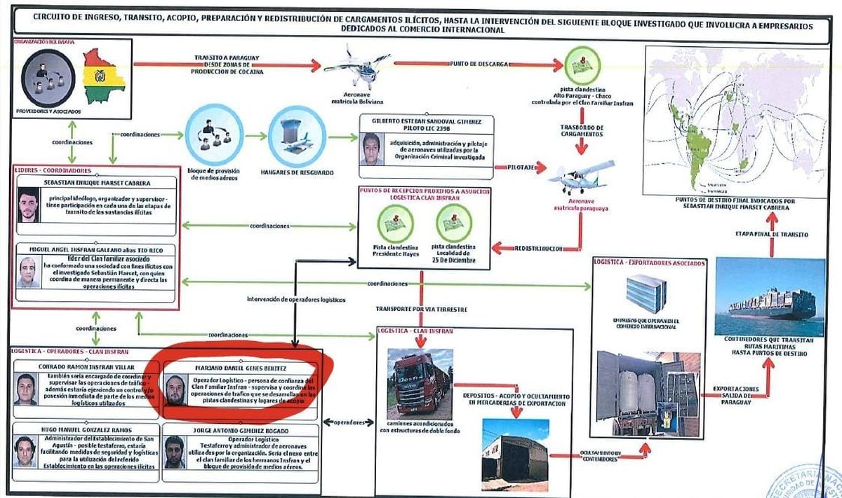 El comisario López añadió que Mariano Genes quedó como el número 1 de la organización tras la detención de Tío Rico, preparando vehículos con doble fondo para transportar cocaína hasta Mariano Roque Alonso y de ahí hasta la frontera con Bolivia.