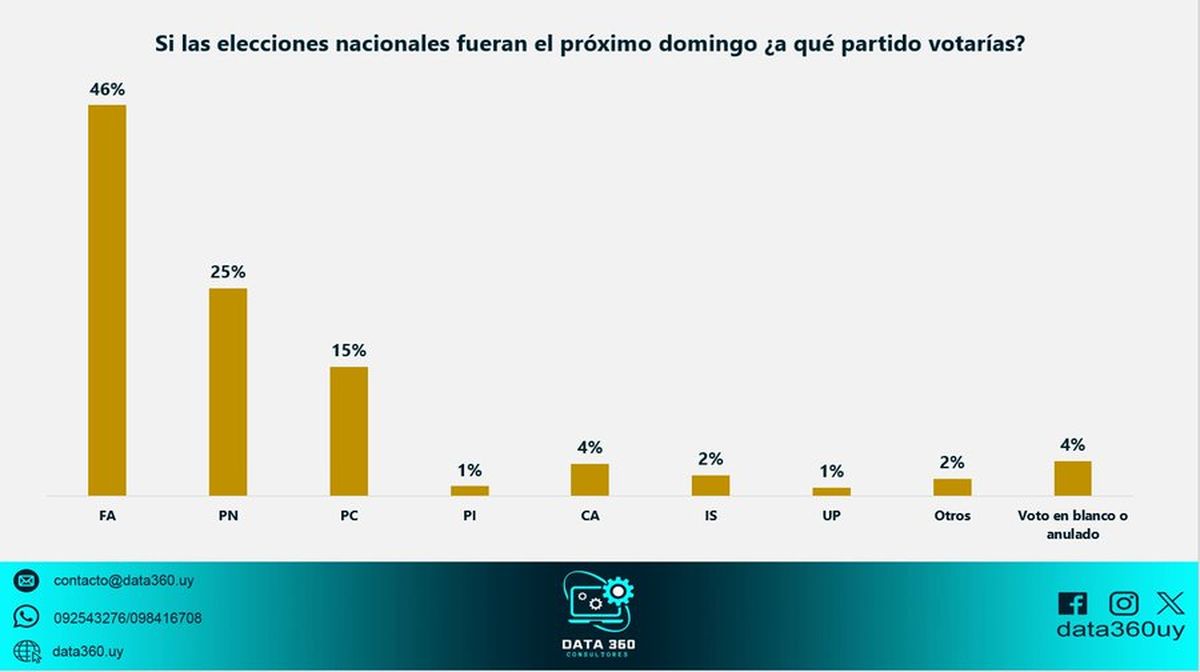 La encuesta, dada a conocer este domingo por MVD Noticias (TvCiudad), señala que si las elecciones fueran este domingo el FA obtendría el 46% de los votos seguidos por el Partido Nacional con 25%, el Partido Colorado con 15%, Cabildo Abierto con 3% y el Partido Independiente con 1%. Identidad Soberana obtendría el 2% de los votos mientras que Unidad Popular-Frente de los Trabajadores llegaría al 1%. Otros partidos obtendrían 1% y 4% votaría blanco o anulado.