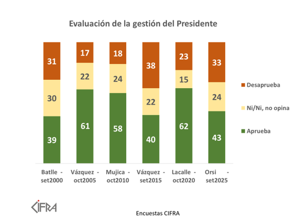 Al comparar los primeros meses de la administración Orsi con las anteriores, señala el informe de Cifra, se observa que hubo tres gestiones que a esta altura recibían una evaluación más positiva: la mejor evaluada fue la de Vázquez en su primer gobierno, seguido de cerca por Lacalle Pou y Mujica. Orsi se ubica cuarto, con una evaluación bastante menos positiva que la de Mujica, pero mejor que la de Vázquez en su segundo gobierno y Batlle en el año 2000.