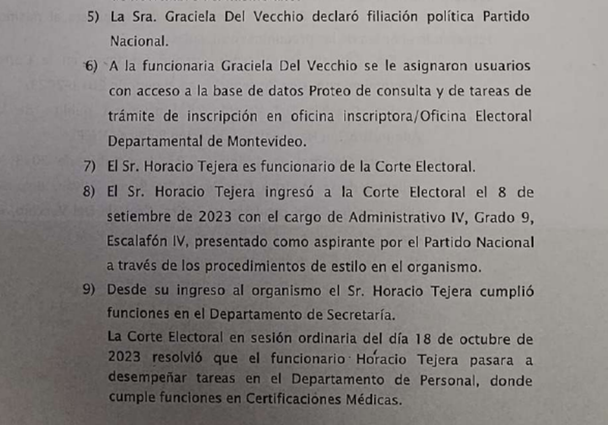 Respecto Horacio Tejera indica la Corte que este es funcionario de la Corte Electoral desde el 8 de setiembre de 2023 y en octubre pasó desempeñar tareas en el “Departamento de Personal, donde cumple funciones en certificaciones médicas”.