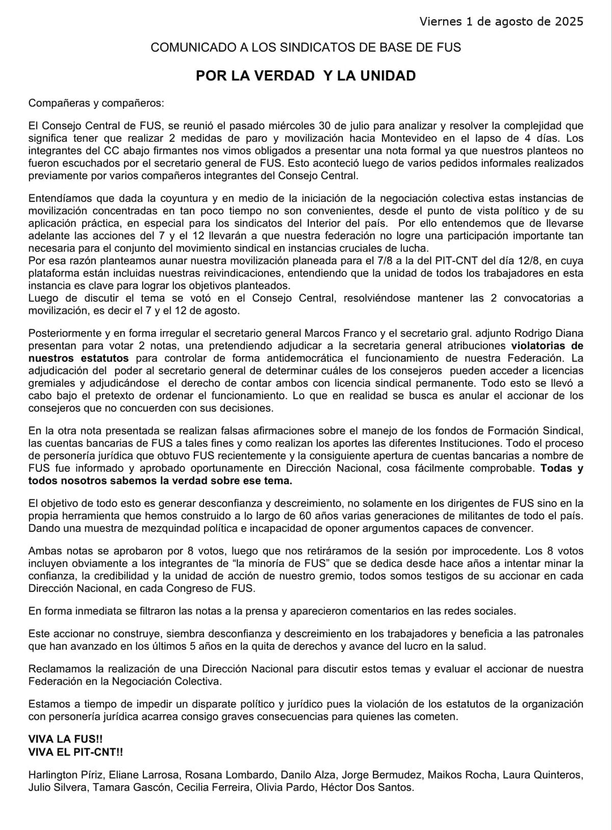 Finalizan su comunicado advirtiendo sobre las "graves consecuencias para quienes las cometen" que acarrean las violaciones de los estatutos de una organización con personería jurídica. El comunicado lleva la firma de Harlington Piriz, Eliane Larrosa, Rosana Lombardo, Danilo Alza, Jorge Bermúdez, Maikos Rocha, Laura Quinteros, Julio Silvera, Tamara Gascón, Cecilia Ferreira, Olivia Pardo y Héctor Dos Santos.