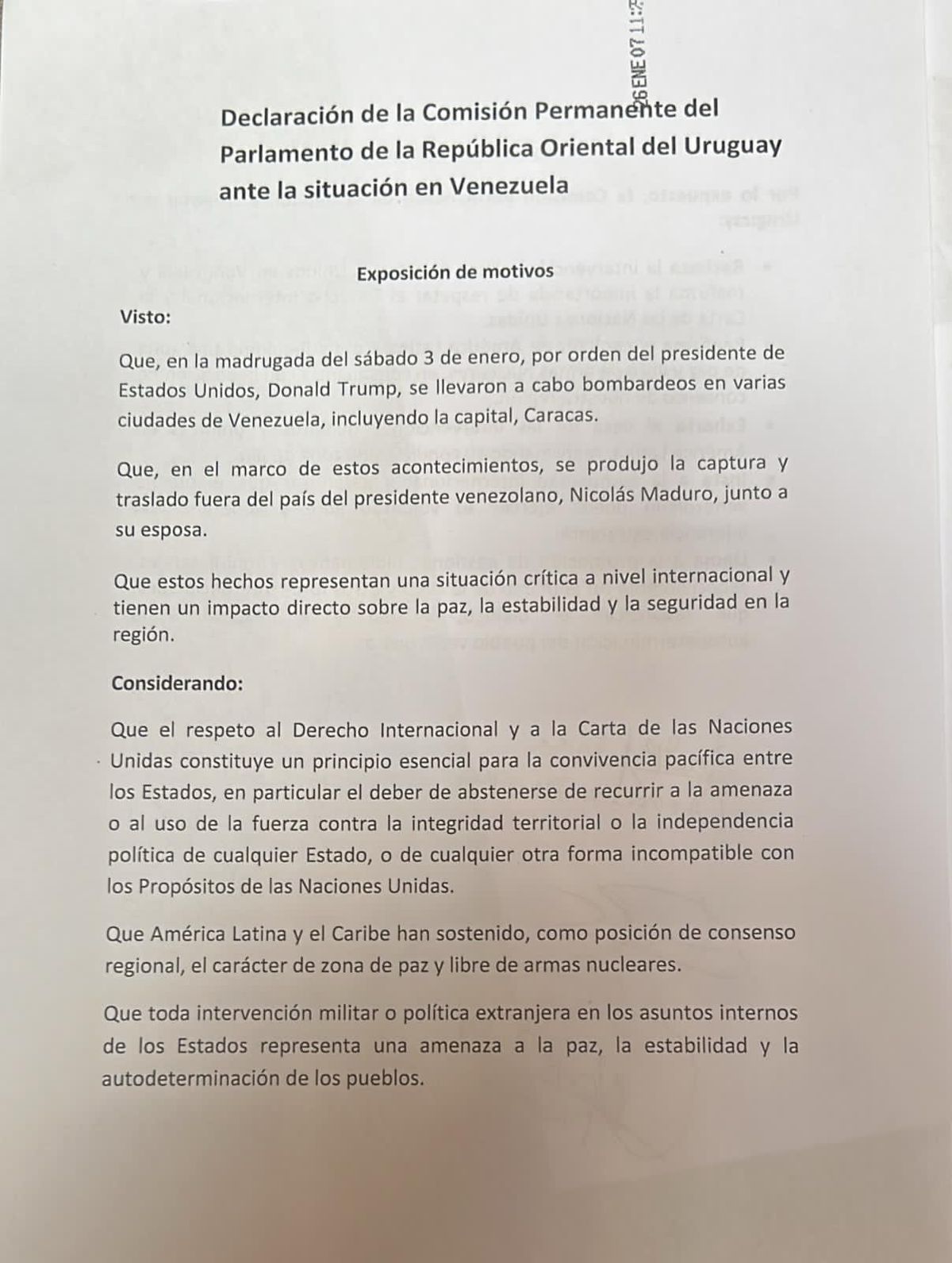 La declaración impulsada por los legisladores del FA, que recibió la mayoría de los votos (6 de 11), rechaza la "intervención militar de Estados Unidos en Venezuela y reafirma la importancia de respetar el derecho internacional y la carta de las Naciones Unidas".