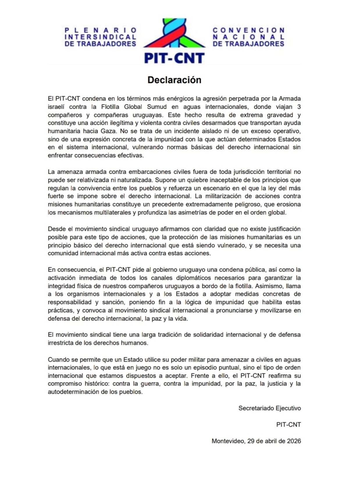 El Secretariado Ejecutivo del PIT-CNT emitió este miércoles una declaración de máxima urgencia para denunciar y condenar la agresión perpetrada por la Armada israelí contra la Flotilla Global Sumud en aguas internacionales. La organización calificó el hecho como una acción "ilegítima y violenta" contra civiles desarmados que transportan ayuda humanitaria hacia Gaza.