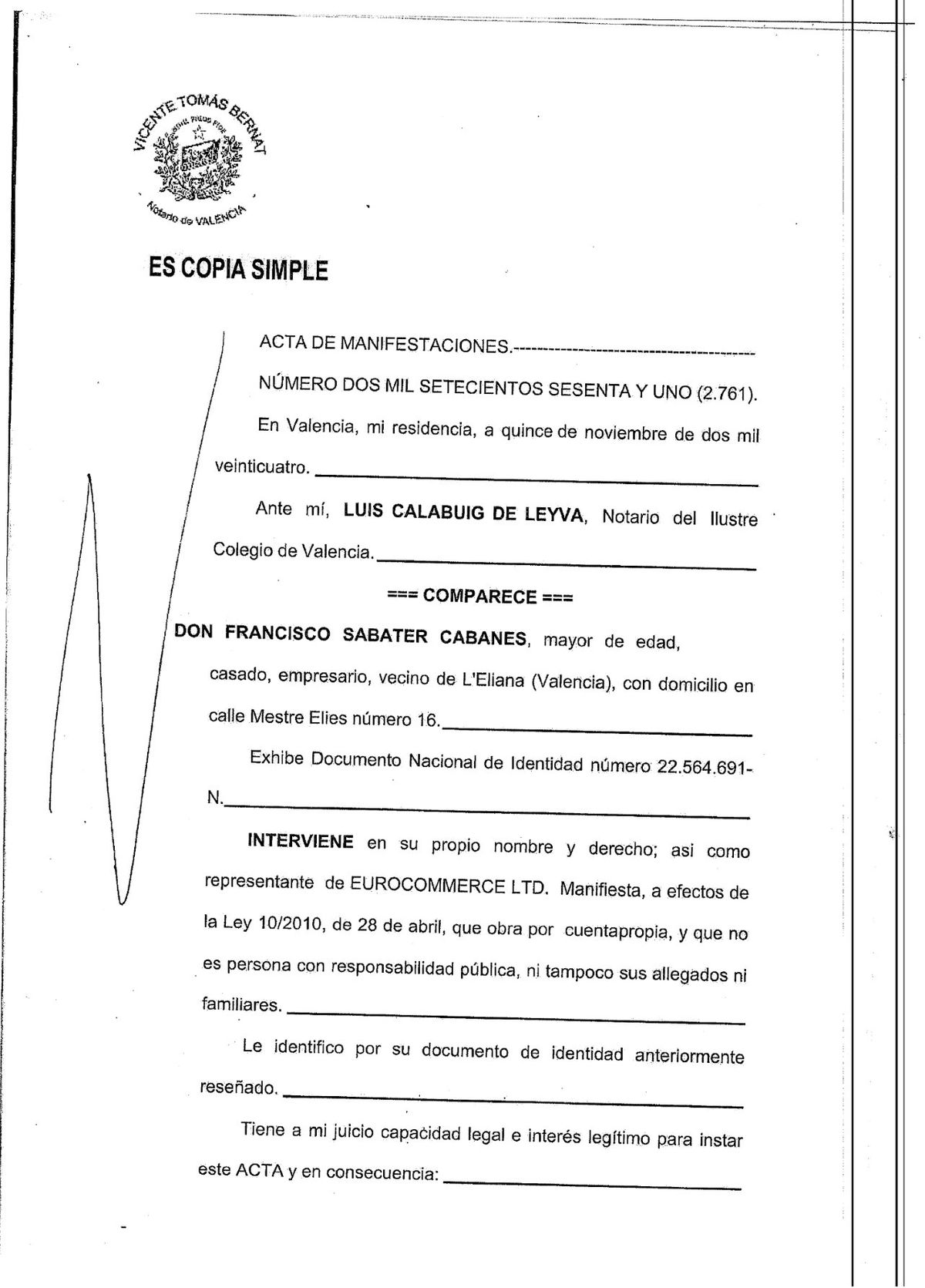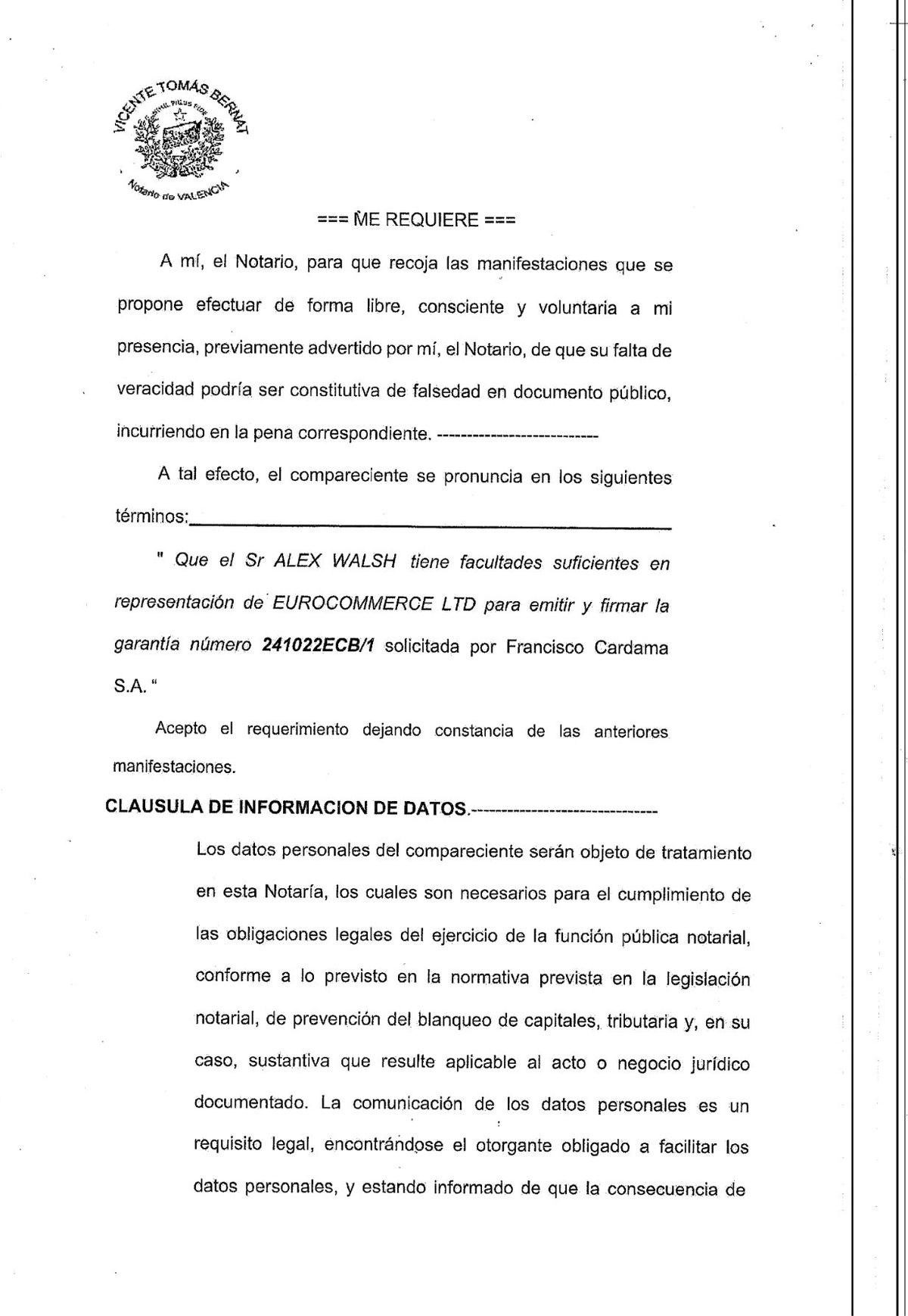 Tras esa observación apareció una "acta de manifestación" fechada el 15 de noviembre de 2024, en la que Calabuig de Leyva supuestamente daba fe de que Sabater Cabanes había declarado que Walsh contaba con poderes suficientes para emitir y firmar la garantía número 241022ECB/1 a nombre de EuroCommerce Limited.