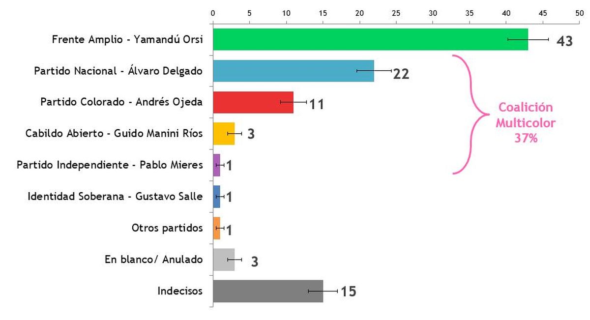 Si las elecciones fueran este domingo el Frente Amplio (FA) obtendría el 43% de votos frente al 22% del Partido Nacional, el que aparece como mejor parado de todos los que integran la coalición de gobierno. El total de los partidos de la coalición reunidos suma el 37% o sea un 6% por debajo de la izquierda.