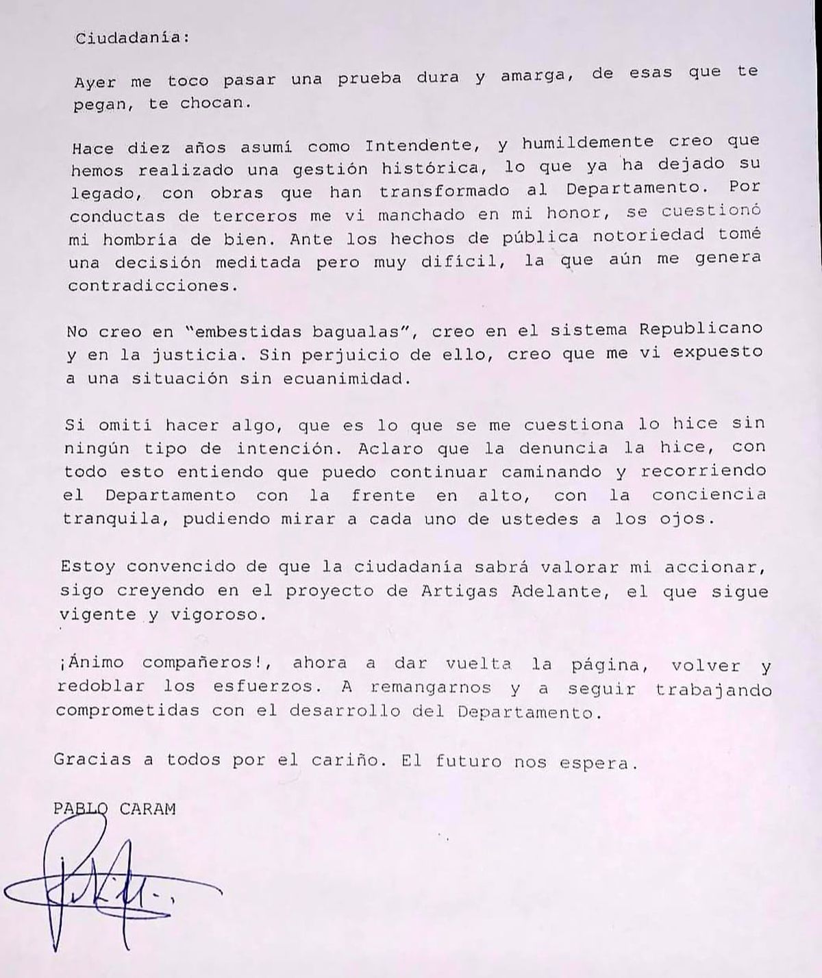 El intendente de Artigas, Pablo Caram fue imputado en el marco de una investigación por el pago irregular de horas extras en la comuna que preside. El jerarca fue condenado por el delito de omisión de los funcionarios públicos a denunciar y se le impuso una pena de 14 meses de prisión, que se sustituye por libertad a prueba.