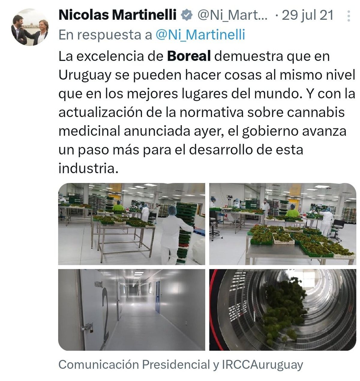 Tras obtener las autorizaciones correspondientes y finalizada la construcción, la planta de Boreal en Salto fue presentada con bombos y platillos, el 7 de setiembre del 2020, por el presidente Lacalle Pou y varios de sus ministros, encandilados ante el proyecto millonario de este uruguayo que había residido en el exterior y volvía a su país a instalar una de las plantas de producción de cannabis medicinal más grande de América Latina, con una inversión de U$S 27.500.000, anunciaban con entusiasmo. Claro que en 2020 nadie sabía quién era Aguiar.