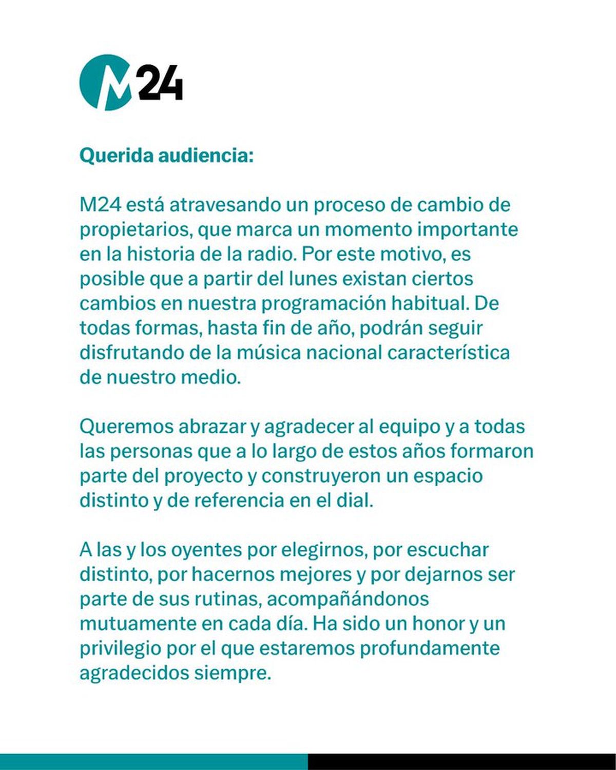 Mientras tanto, en un mensaje previo M24 indicó que la emisora “está atravesando un proceso de cambio de propietarios, que marca un momento importante en la historia de la radio. Por este motivo, es posible que a partir del lunes existan ciertos cambios en nuestra programación habitual”.
