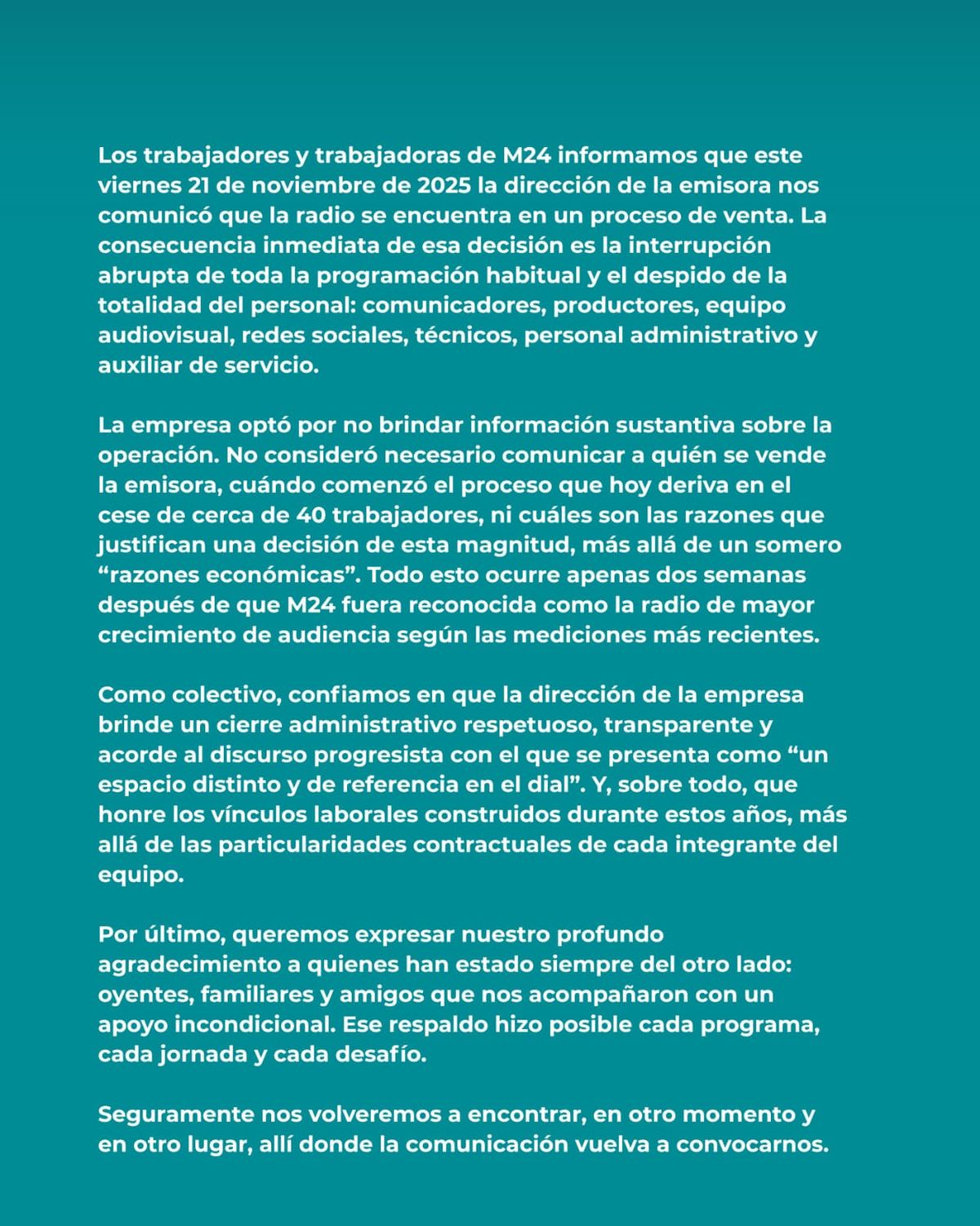 En la noche de este viernes, los trabajadores de la emisora hicieron saber de su situación: “este viernes 21 de noviembre de 2025 la dirección de la emisora nos comunicó que la radio se encuentra en un proceso de venta. La consecuencia inmediata de esa decisión es la interrupción abrupta de toda la programación habitual y el despido de la totalidad del personal: comunicadores, productores, equipo audiovisual, redes sociales, técnicos, personal administrativo y auxiliar de servicio”.