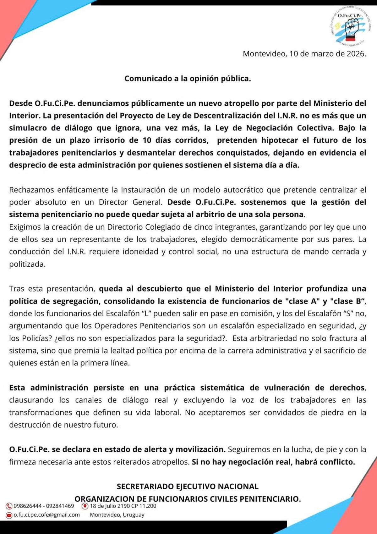 La Organización de Funcionarios Civiles Penitenciarios (O.Fu.Ci.Pe.) emitió un comunicado en el que denuncia públicamente algunos aspectos contenidos en el proyecto de ley que elevó el Poder Ejecutivo (Ministro del Interior) para descentralizar el Instituto Nacional de Rehabilitación (INR).