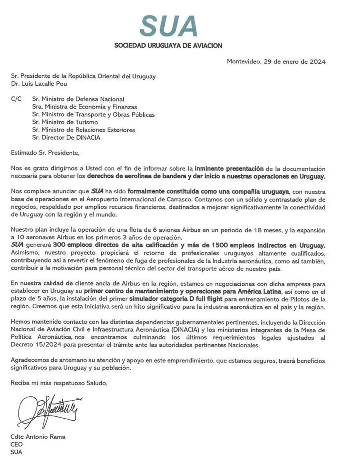 El 29 de enero la aerolínea Sociedad Uruguaya de Aviación (SUA) envió una carta al Gobierno, dirigida al presidente de la República, Luis Lacalle Pou, a cinco ministerios (Defensa, Economía, Transporte y Obras Públicas, Turismo y Relaciones Exteriores) y a la Dirección Nacional de Aviación Civil e Infraestructura Aeronáutica (Dinacia). En el documento, la nueva compañía uruguaya informó la “inminente” presentación de la documentación necesaria para convertirse en una aerolínea de bandera uruguaya y empezar a operar.
