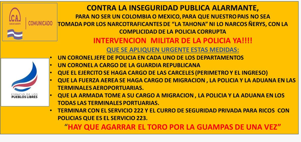 El grupo "Patria o Muerte" que reivindica el rol jugado por las Fuerzas Armadas durante el Terrorismo de Estado propone en le mismo comunicado: "Si la patria lo necesita proponemos la formación de las Fuerzas Conjuntas, bajo el mando del Ejército y la activación de la Justicia Militar, como en los años 70, que en menos de 6 meses derrotaron a la subversión tupamara y en unos años a los comunistas y limpiaron la patria de esa escoria apátrida, por eso en unos meses estas organizaciones criminales de Narco Ñerys y de Narcos de cuello blanco de la Tahona, no van a durar ni 6 meses , además de limpiar a la Policía Corrupta, para que vuelvan a ser profesionales".