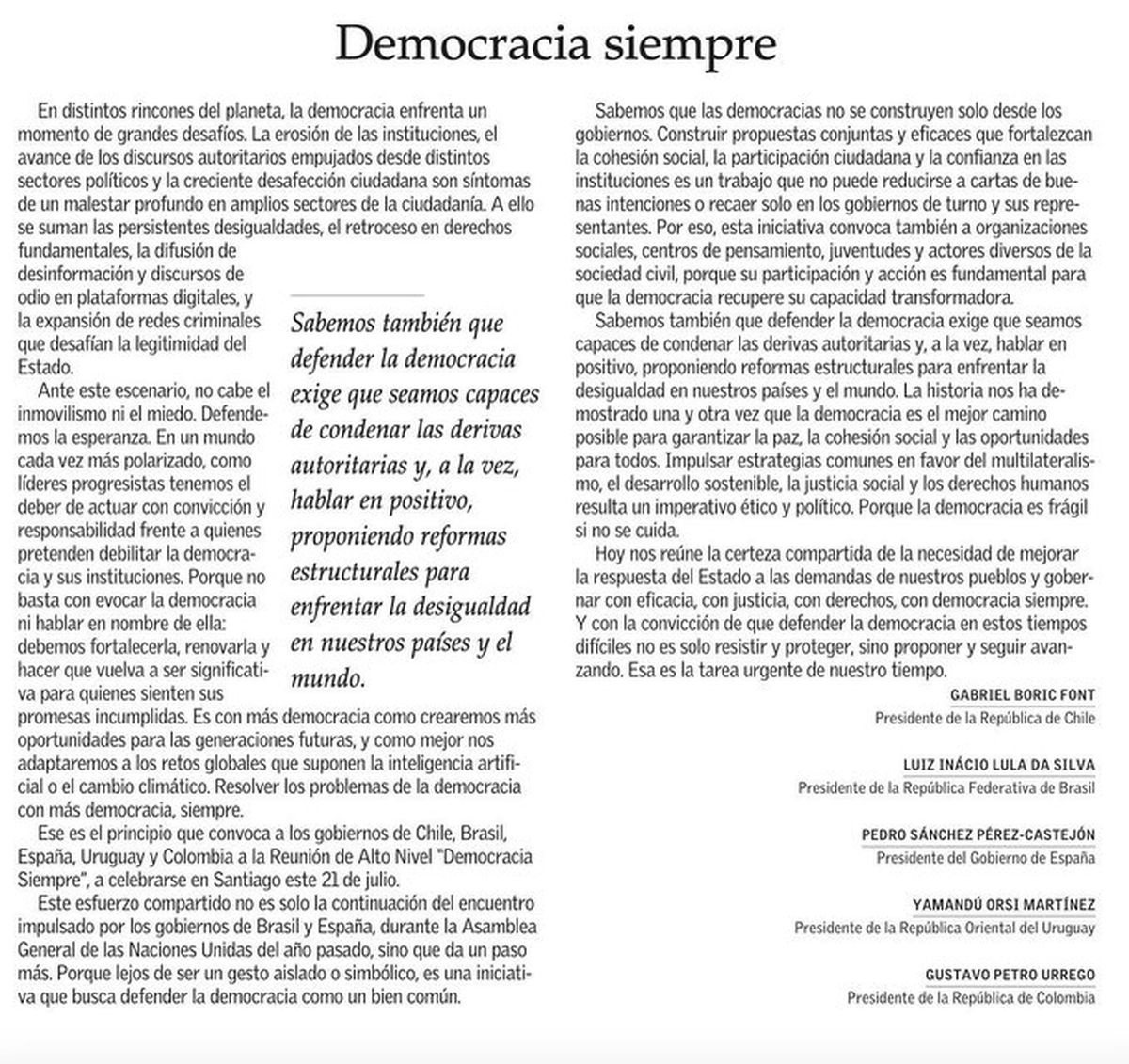 "La erosión de las instituciones, el avance de los discursos autoritarios empujados desde distintos sectores políticos y la creciente desafección ciudadana son síntomas de un malestar profundo en amplios sectores de la ciudadanía. A ello se suman las persistentes desigualdades, el retroceso en derechos fundamentales, la difusión de desinformación y discursos de odio en plataformas digitales, y la expansión de redes criminales que desafían la legitimidad del Estado", señalan los presidentes Gabriel Boric (Chile), Luiz Inácio Lula da Silva (Brasil), Pedro Sánchez (España), Yamandú Orsi (Uruguay) y Gustavo Petro (Colombia).