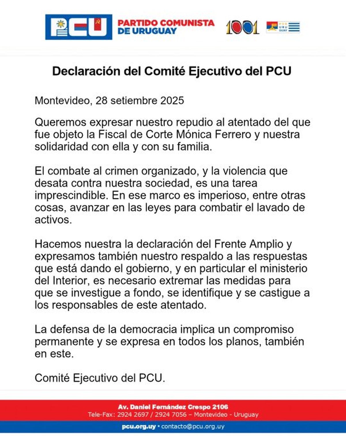 El Partido Comunista (PCU) repudió el atentado contra la fiscal de Corte, Mónica Ferrero, y respaldó las acciones que está llevando adelante el Ministerio del Interior (MI). "La defensa de la democracia implica un compromiso permanente y se expresa en todos los planos, también en este", afirma.