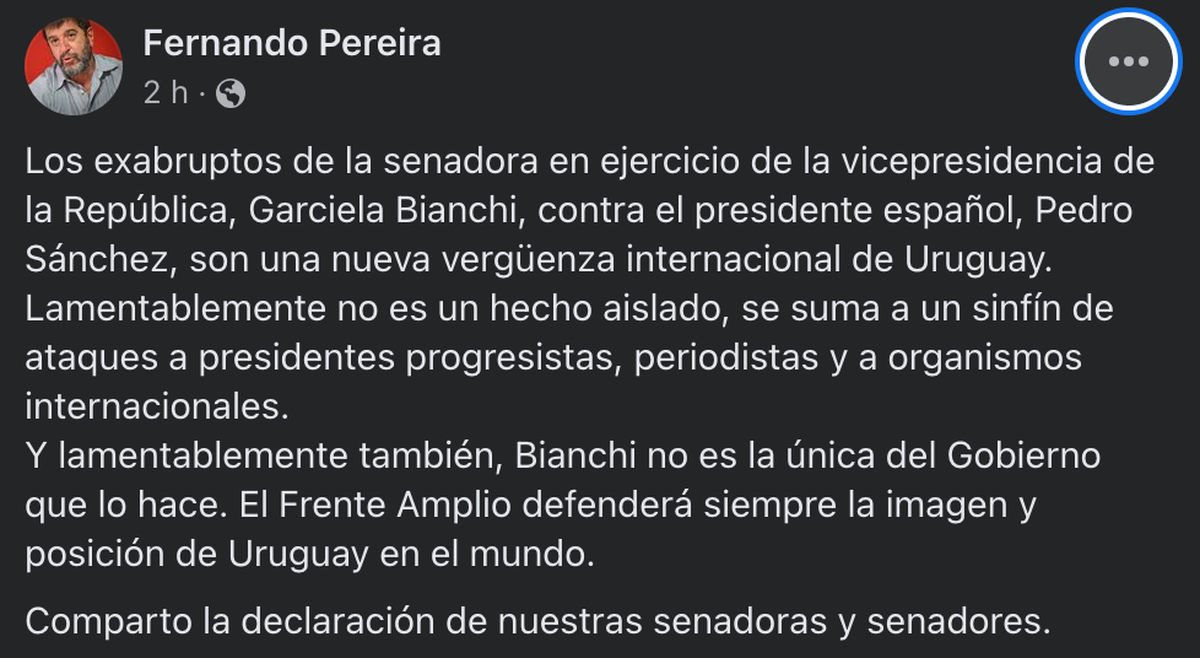 Luego de las declaraciones de la senadora del Partido Nacional Graciela Bianchi, quien desencadenó un conflicto diplomático con España tras escribir en su cuenta de Twitter que el PSOE (partido que actualmente gobierna el país ibérico) financia las "narcodictaduras cubana, venezonala, nicaragüense, iraní", el presidente del Frente Amplio, Fernando Pereira, dijo que los dichos de la senadora nacionalista "se suma a un sinfín de ataques a presidentes progresistas, periodistas y a organismos internacionales".