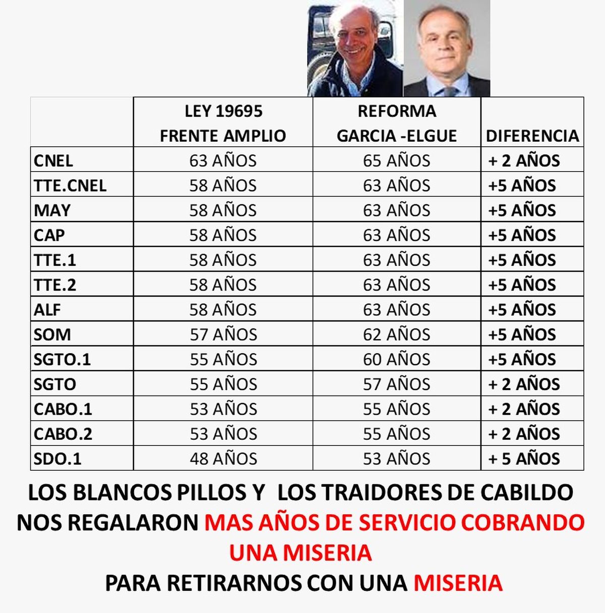 En el nuevo mensaje circula una placa comparativa entre el sistema de retiros vigentes y el aprobado por la reforma mencionada "García- Elgue", calculando los años para la jubilación con una leyenda que aduce a Cabildo Abierto : "Los blancos pillos y los traidores de Cabildo nos regalaron mas años de Servicio cobrando una miseria para retirarnos con una miseria".