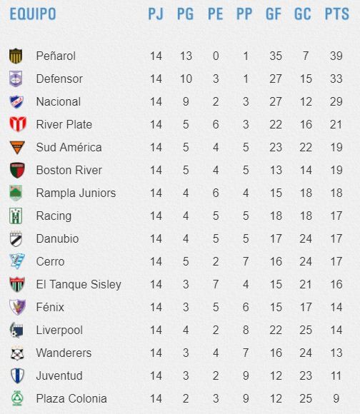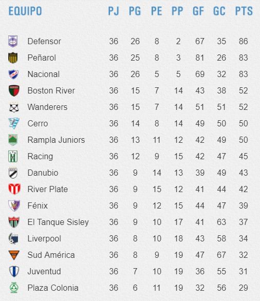 Las posiciones marcan que Peñarol fue el campeón del Clausura, aquella «única bala» de la que se hablaba para Peñarol después del Apertura y el Intermedio, la usó bien, ganó y se metió en la definición del campeonato. Ahora Defensor, como ganador del Apertura, deberá jugar con Peñarol ganador del Clausura, para ver quien juega con el ganador de la Anual. Si la Anual la ganara uno de los dos, y ese mismo equipo ganara este encuentro es campeón Uruguayo sin finales, si el que la gana no es campeón de la Anual, van a dos partidos finales para determinar quien es el campeón Uruguayo. Si el campeón de la Anual es un tercer equipo en discordia, el gandor del partido entre campeón del Apertura y campeón del Clausura, jugará dos encuentros finales con el campeón de la Anual, para establecer el campeón Uruguayo. Pero previo a esta definición hay que saber quién es el campeón de la tabla Anual. Para esto hay definición entre tres equipos en la última fecha; Defensor es el puntero con 86 puntos y una diferencia de gol de más 32, Peñarol tiene 83 y más 55, mientras que Nacional tiene 83 puntos y más 37. Con un empate Defensor es campeón de la Anual. Perdiendo, Defensor puede ser campeón de la Anual, si Peñarol y Nacional pierden o empatan. El único que puede ser campeón el domingo de la tabla Anual es Defensor, porque si el violeta pierde, Peñarol gana y Nacional pierde o empata, hay final por la tabla Anual entre Peñarol y Defensor. Si Defensor pierde, Nacional gana, y Peñarol pierde o empata, hay final por la tabla Anual entre Defensor – Nacional. Pero si Defensor pierde y ganaran Peñarol y Nacional, la final de la tabla Anual será entre Peñarol y Nacional por la diferencia de gol, ya que al estar los tres con el mismo puntaje el reglamento (artículo 62) dice en su primer item que se ordenan por la diferencia de gol. TABLA CLAUSURA