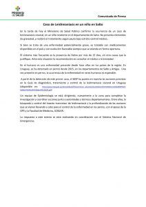 El Ministerio de Salud Pública (MSP) confirmó la ocurrencia de un caso de leishmaniasis visceral en un niño residente en Salto. Si bien el menor no presenta elementos de gravedad, explica la cartera que igualmente recibirá el tratamiento según está pautado, bajo estricto control médico.